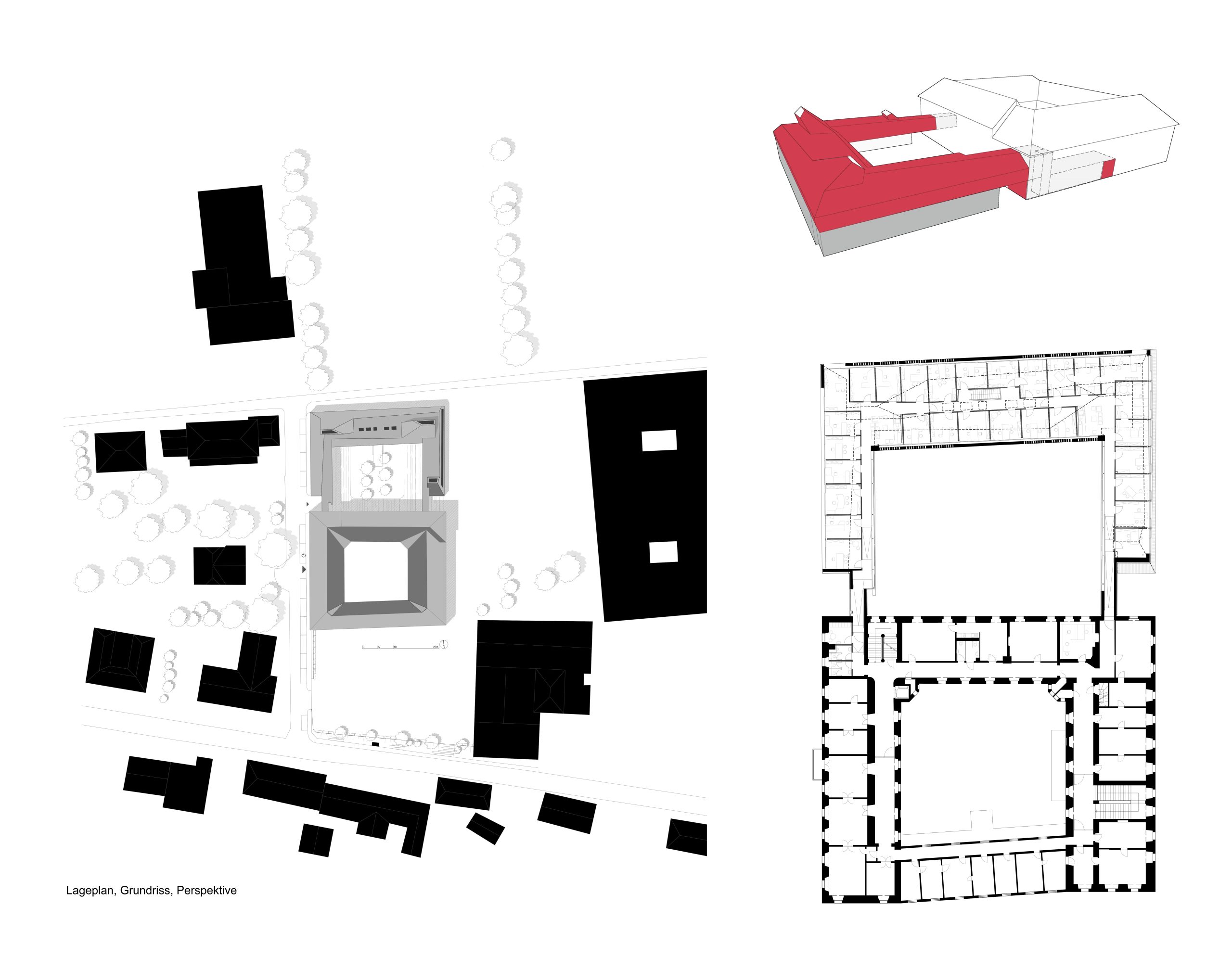 Die ehemalige Dachstruktur der Stallungen wurde durch einen neuen Aufbau ersetzt, der historische Elemente aufgreift, interpretiert und auf unterschiedliche funktionale Anforderungen reagiert. Die Hofflächen wurden von Parkplatzflächen in Grünbereiche verwandelt und zentral neu bepflanzt. Bestehende Erschließungen des Hauptgebäudes wurden gestärkt und zu einer kompakten Zone für Infopoint, Nebenfunktionen und vertikale Verbindungen zusammengeführt, während Zugänge zum Gesundheitsamt unverändert blieben. Die neuen Räume orientieren sich an einem Nord-Süd-Verlauf als Einhüfter, im rückwärtigen Bereich als zweihüftige Bürostruktur. Direkt darunter befinden sich die Archivbereiche, weitere Nebenräume wurden sinnvoll in den verbleibenden Flächen integriert.
