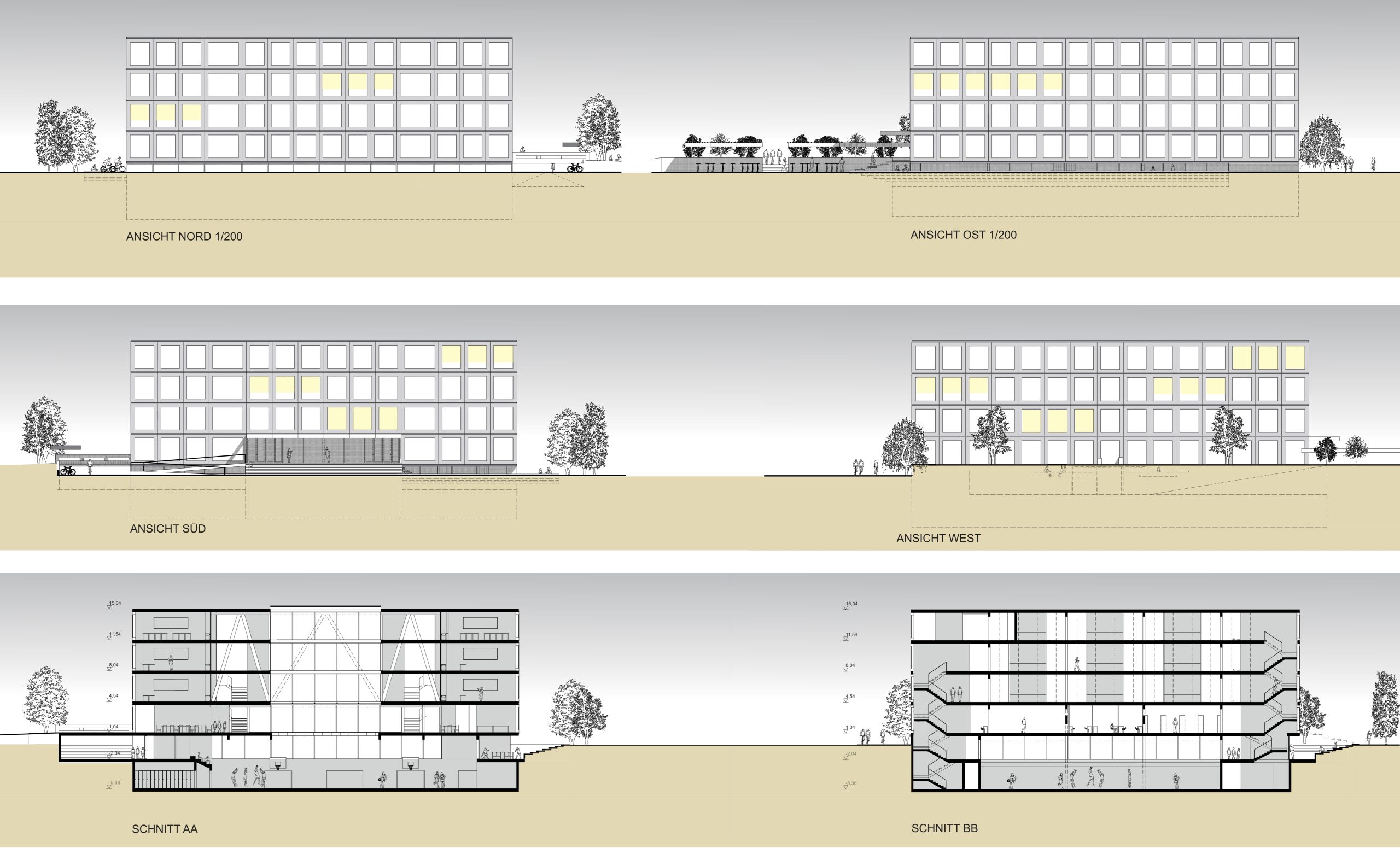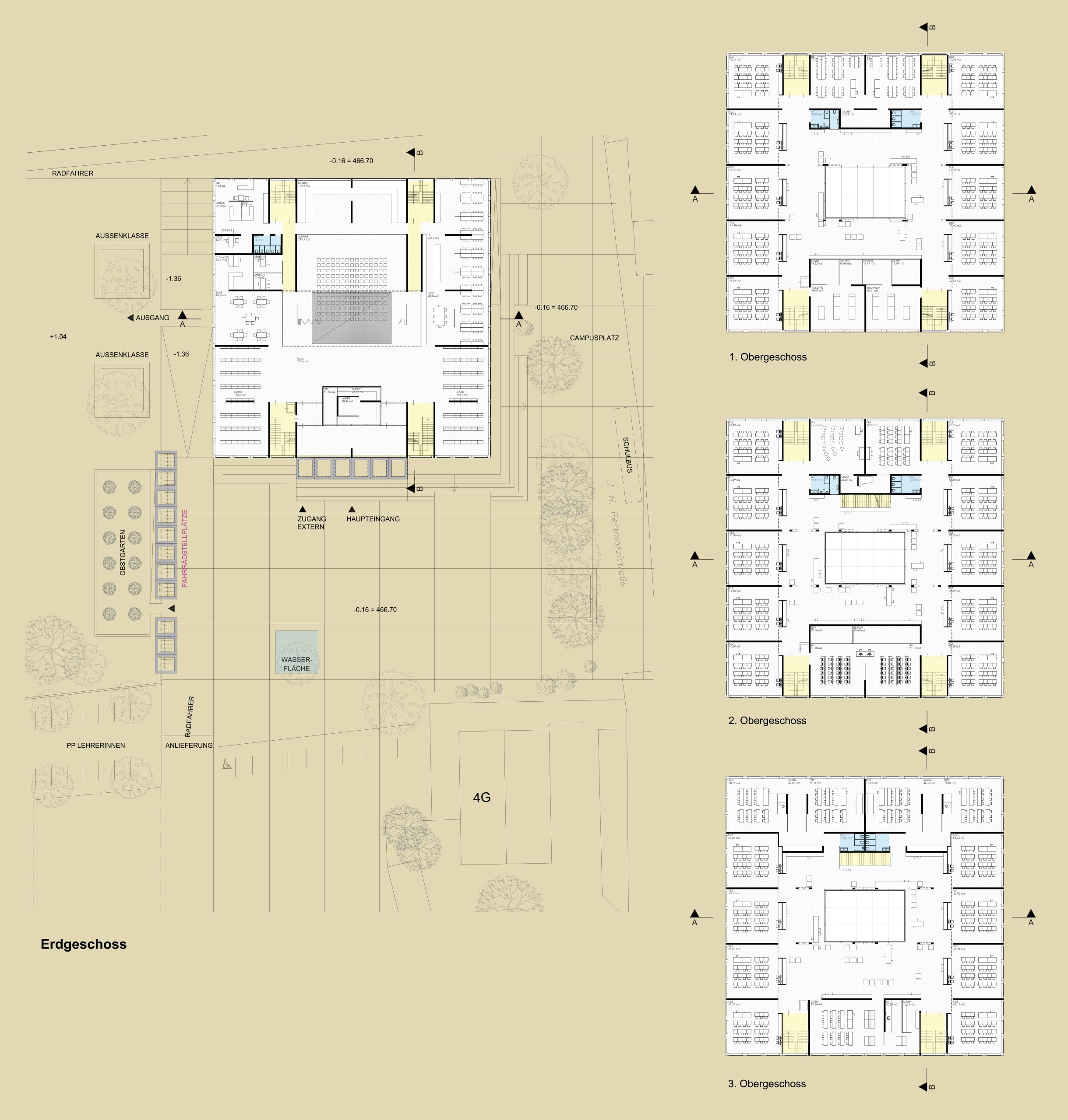 Die Klassenzimmer sind als offene Zonen mit vorgelagerten Bereichen konzipiert und können für die Stammfunktion abgetrennt werden. Die Lernzonen orientieren sich nach innen zu einem gemeinsamen Innenhof, dessen Flächen geöffnet und übergreifend genutzt werden können. So entstehen großzügige Flächen, die auch außerhalb der regulären Unterrichtszeiten flexibel bespielt werden können. Der dreigeschossige Trakt ruht auf einer Erdgeschosszone, die öffentliche Funktionen und Lehrerarbeitsplätze aufnimmt. Die zentrale Garderobe schafft Präsenz für die Schülerinnen im Erdgeschoss und helle, einladende Räume. Die Turnhallen wurden ins Untergeschoss verlegt, bleiben aber über angehobene EG-Zonen mit Tageslicht und natürlicher Belüftung versorgt. Eine Tribüne kann von außen zugänglich gemacht werden, und die gedeckte Pausenfläche an der Ostseite schützt vor Sonne und Regen und kann als Freiklassenfläche genutzt werden.