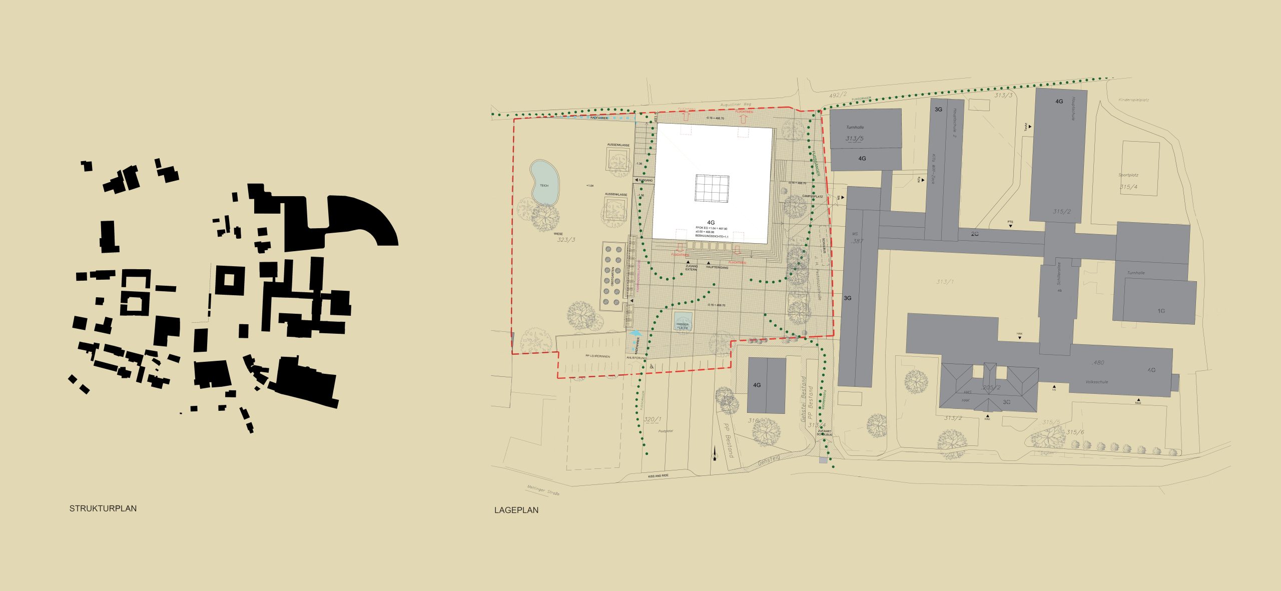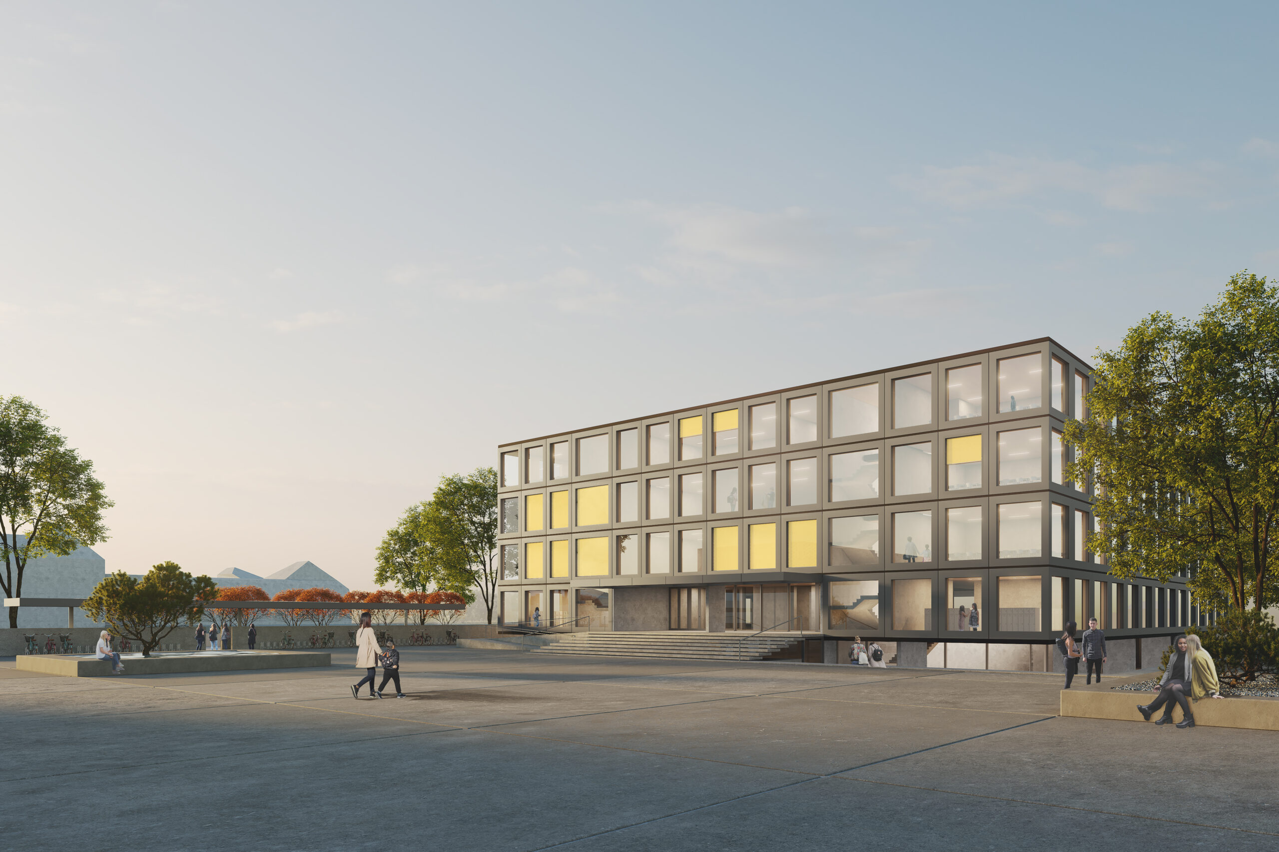 Das Projekt BG & BRG Völkermarkt positioniert den Neubau als westlichen Abschluss des Bildungscampus und reagiert sensibel auf bestehende Erschließungsrichtungen und Zugangsströme. Der kompakte Baukörper fügt sich gegenüber dem bestehenden Turnsaaltrakt ein und nutzt die Nähe zu benachbarten Funktionen für Synergien. Eine langgestreckte Wand mit aufgelagerter Überdachung der Fahrradabstellplätze orientiert sich an der Flucht des südlich geplanten Gewerbebaus und schafft gleichzeitig eine eindeutige Anbindung vom Parkplatz. Dieser geht in eine großzügige städtische Platzsituation über, die von einer bestehenden Baumreihe im Osten begrenzt wird. Eine Fortschreibung des Belags vermittelt die Zusammengehörigkeit der Flächen und zoniert die unterschiedlichen Nutzungsbereiche.