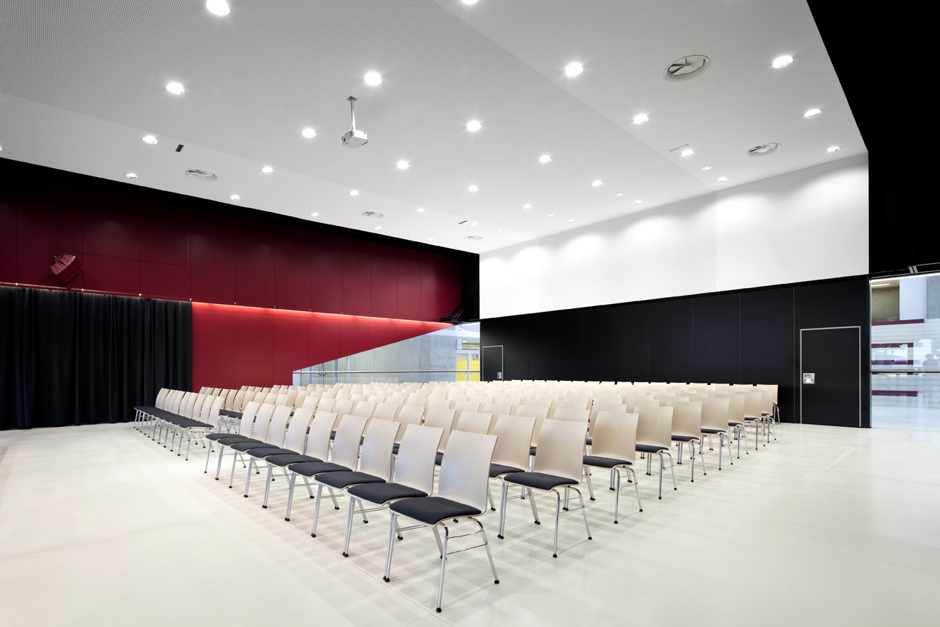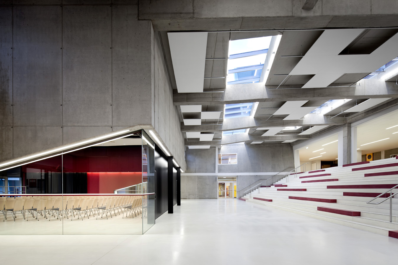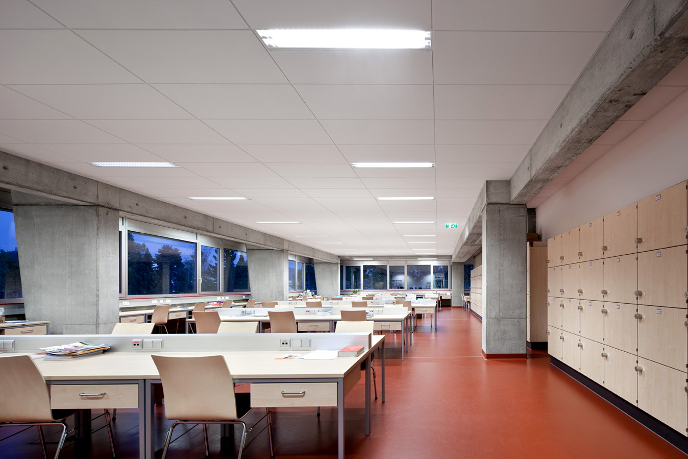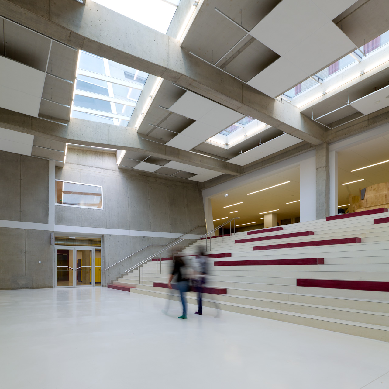 Das neue Bauvolumen präsentiert sich als homogene Füllmasse, die Nischen und Freiräume aufgreift und sich harmonisch in den bestehenden Kontext einfügt. Fassade und Dach bestehen aus Fertigbetonelementen, deren durchgängige Materialität den Entwurfsansatz der Homogenität unterstreicht. Im Innenbereich wurden die Leitfarben Rot und Gelb des Bestands übernommen und zu großzügigen, einheitlichen Flächen ausgebaut, die Ruhe und Gelassenheit vermitteln – optimale Voraussetzungen für die jungen, wissbegierigen Nutzerinnen und Nutzer.