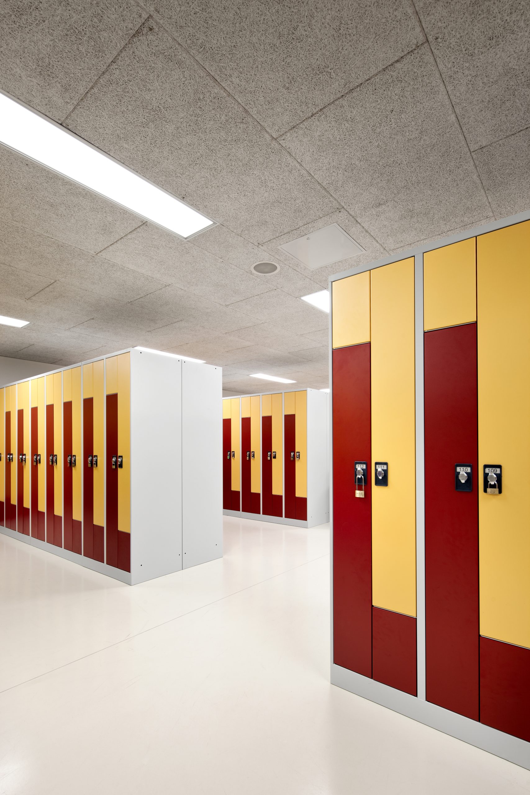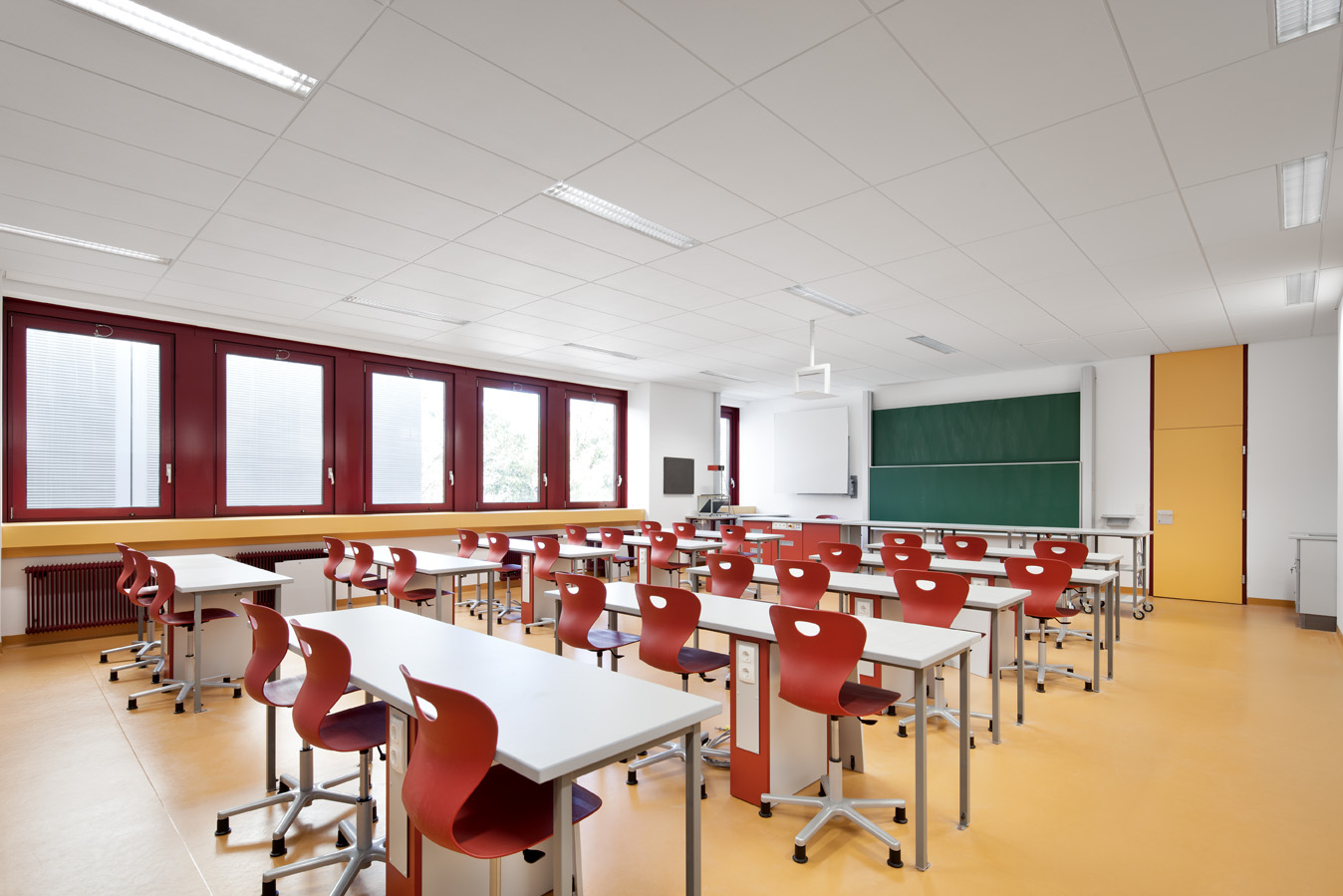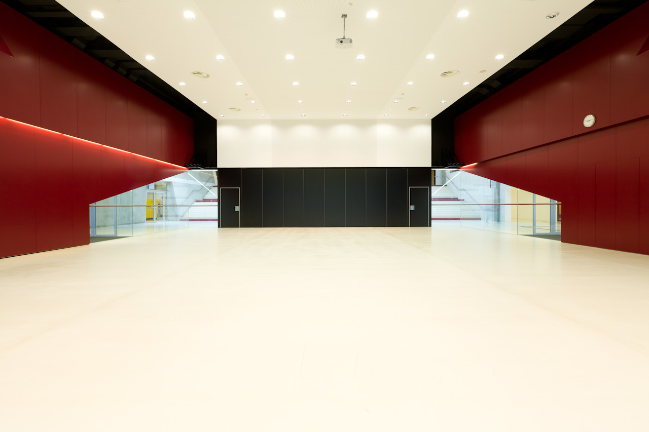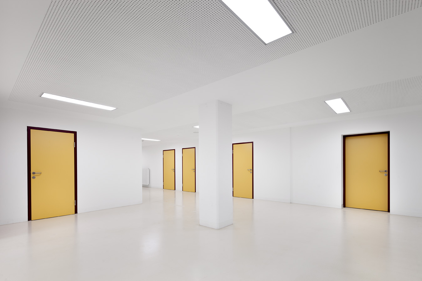 Das neue Bauvolumen präsentiert sich als homogene Füllmasse, die Nischen und Freiräume aufgreift und sich harmonisch in den bestehenden Kontext einfügt. Fassade und Dach bestehen aus Fertigbetonelementen, deren durchgängige Materialität den Entwurfsansatz der Homogenität unterstreicht. Im Innenbereich wurden die Leitfarben Rot und Gelb des Bestands übernommen und zu großzügigen, einheitlichen Flächen ausgebaut, die Ruhe und Gelassenheit vermitteln – optimale Voraussetzungen für die jungen, wissbegierigen Nutzerinnen und Nutzer.