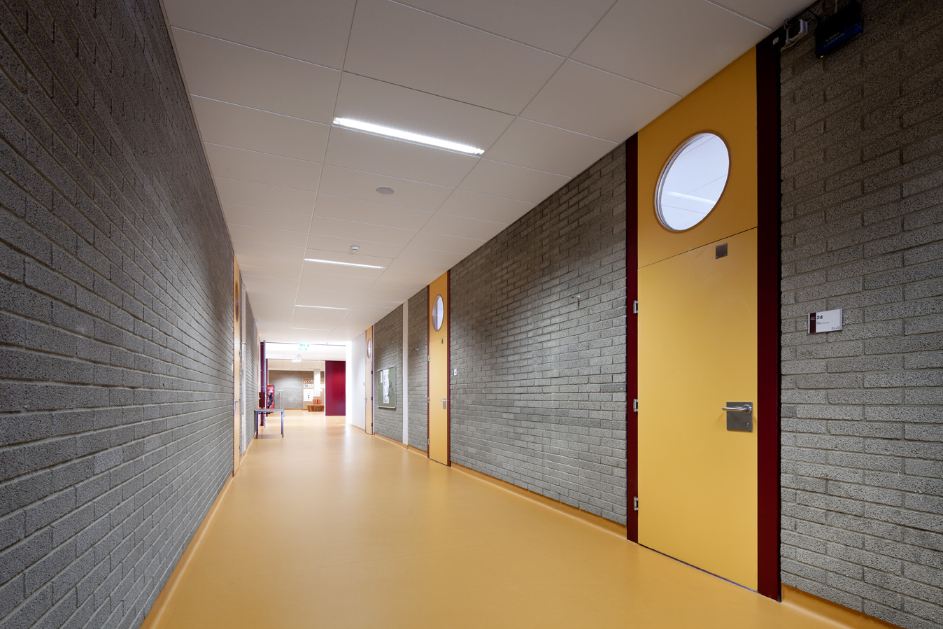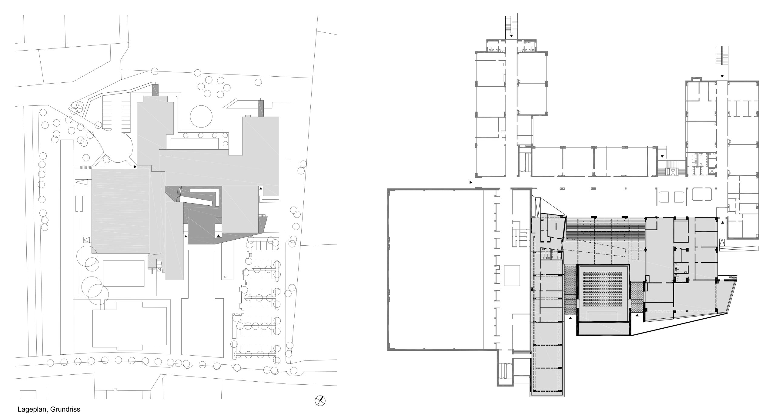 Der Zubau füllt vorhandene Leerbereiche und nutzt das erforderliche Bauvolumen optimal. So wurde der Innenhof geschlossen und beherbergt nun die Eingangshalle sowie einen Mehrzwecksaal. Ein bestehender, auf Säulen stehender Klassentrakt wurde zweigeschossig unterbaut, in diesen Bereichen wurden Verwaltungszonen und Schülergarderoben angeordnet. Die beiden Schulbereiche wurden funktional voneinander entkoppelt, während großzügige Lehrerarbeitsräume für beide Schulen geschaffen wurden. Auch der ehemals obsolet gewordene Schutzbunker konnte sinnvoll in das Raumprogramm integriert werden.