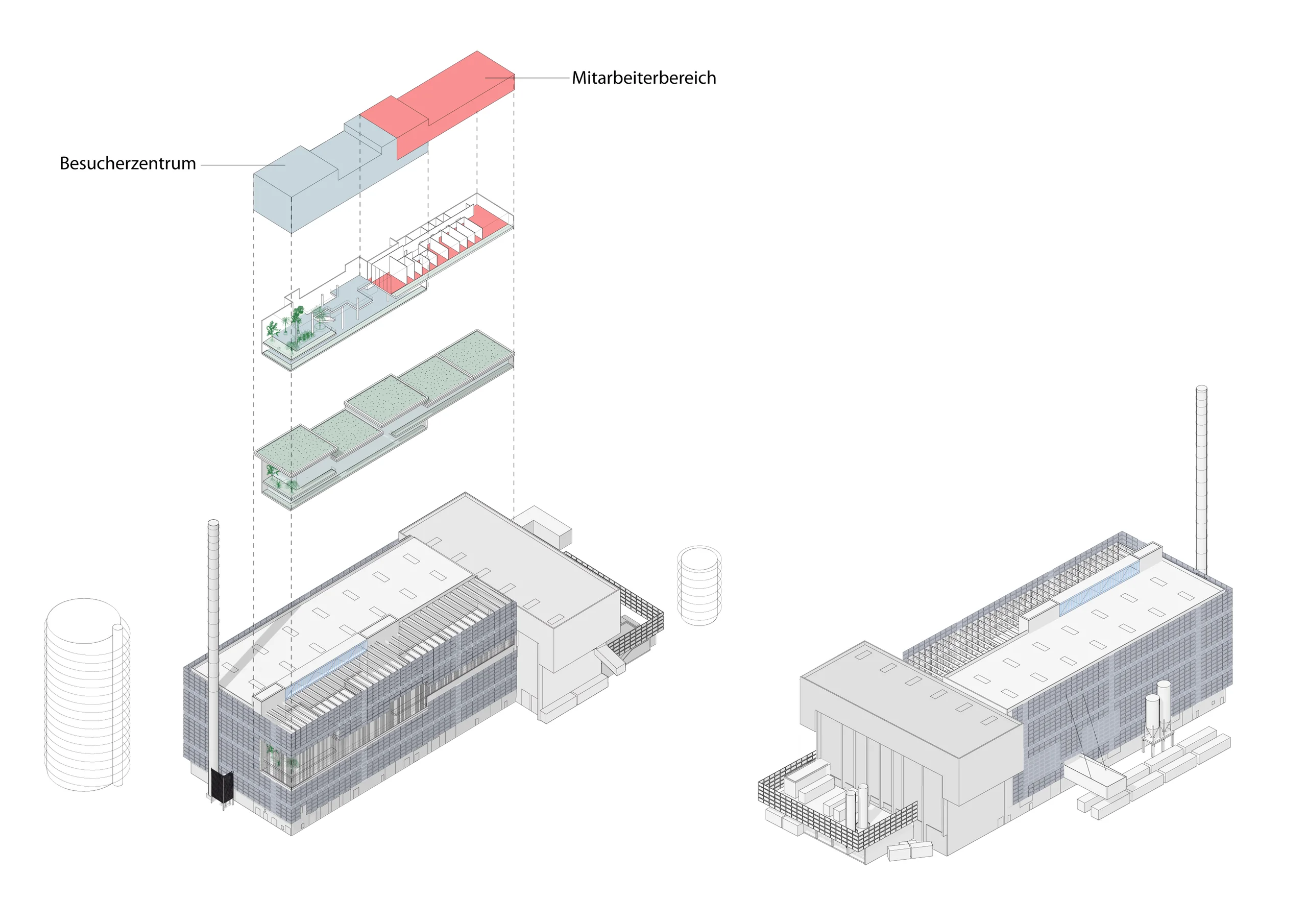 Die schlichte Kubatur der Anlage als städtische Großform wird bewusst durch eine markante Öffnung unterbrochen – eine architektonische „Fuge“, die funktional wie atmosphärisch wirkt. Darin sind Mitarbeiterräume und ein Besucherzentrum untergebracht, das als kommunikative Schnittstelle zwischen Technik, Umwelt und Öffentlichkeit dient. Seminarräume, Büros, Besprechungs- und Aufenthaltsbereiche inklusive einer „Klimagalerie“ mit botanischem Forum sind offen organisiert und vermitteln nachhaltig Energieerzeugung auf anschauliche Weise.