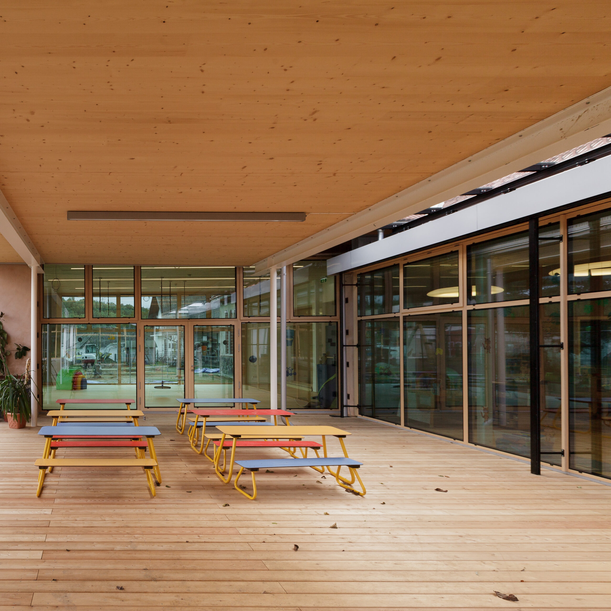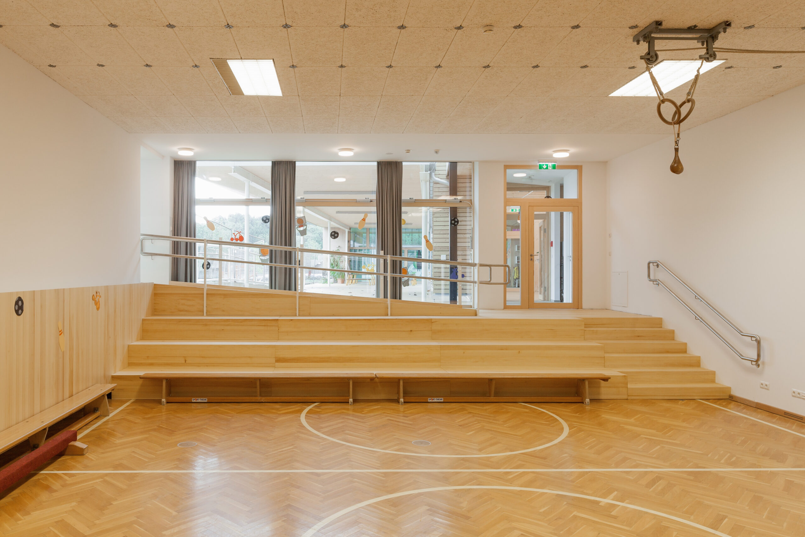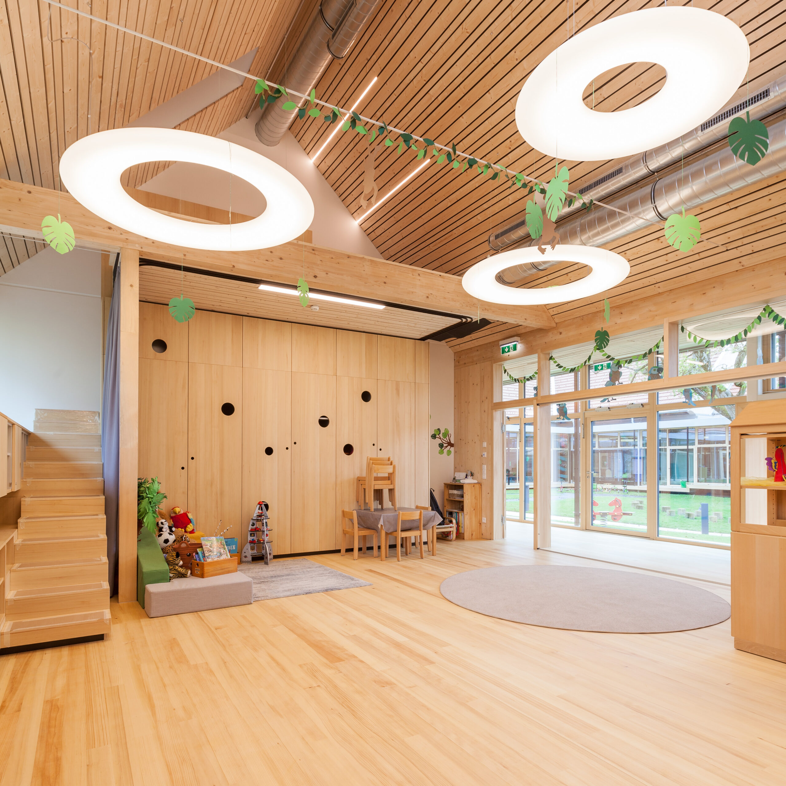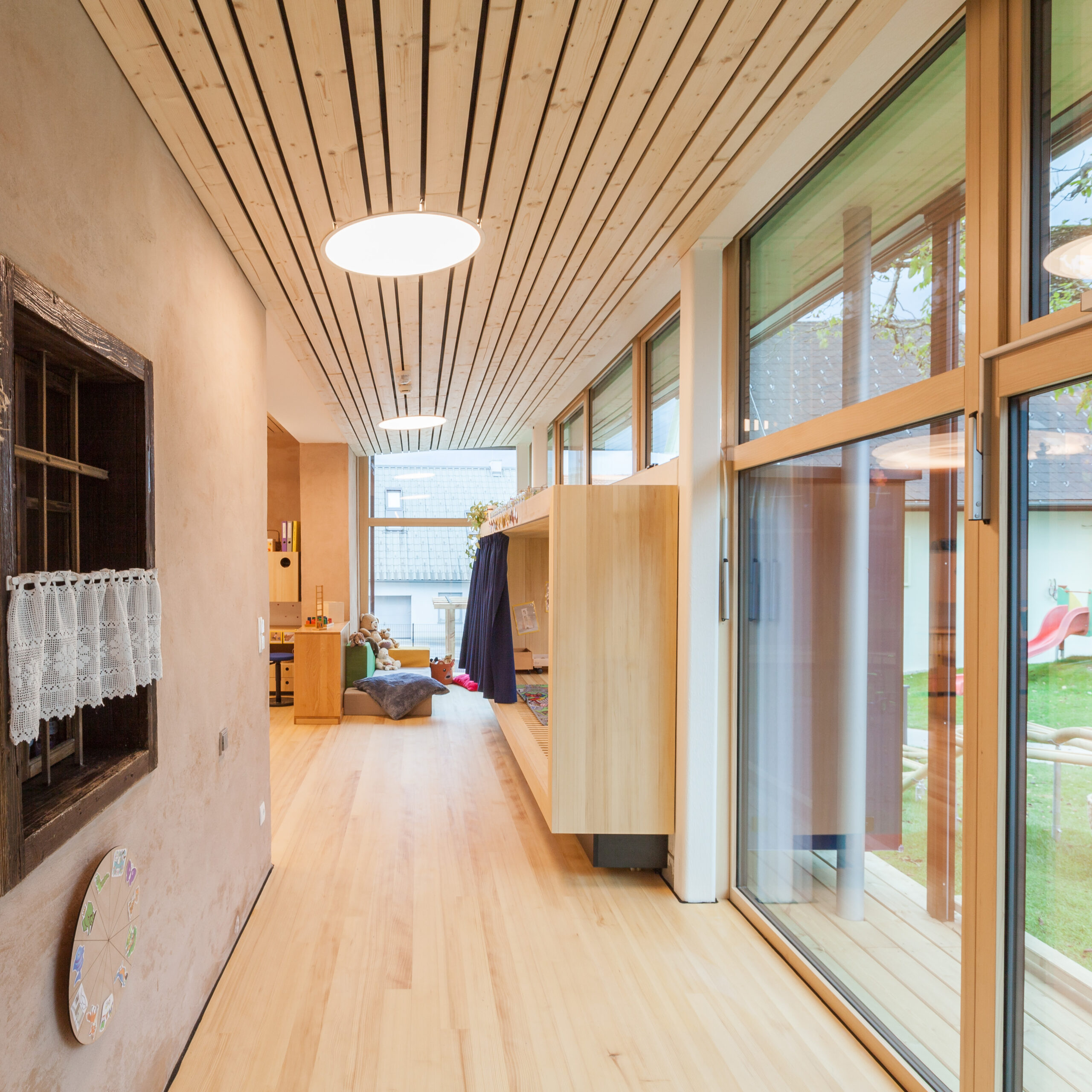 Die Erschließungszone ist als überbreiter, hofseitig orientierter Gang ausgebildet, der nicht nur der Bewegung dient, sondern als erweiterter Spiel- und Aufenthaltsraum genutzt wird. Durch gezielt gesetzte Zonierungen und Sitzfenster entstehen differenzierte Bereiche – von aktiven Spielflächen wie einer „Rennstrecke“ bis hin zu ruhigen Rückzugszonen. Farblich gestaltete Sitzfenster fungieren als identitätsstiftende Elemente und erleichtern die Orientierung innerhalb der Gruppenbereiche. Transparente und großflächig öffenbare Trennungen zwischen Gang- und Gruppenräumen ermöglichen flexible Nutzungen und eine bedarfsgerechte Verbindung der Räume.