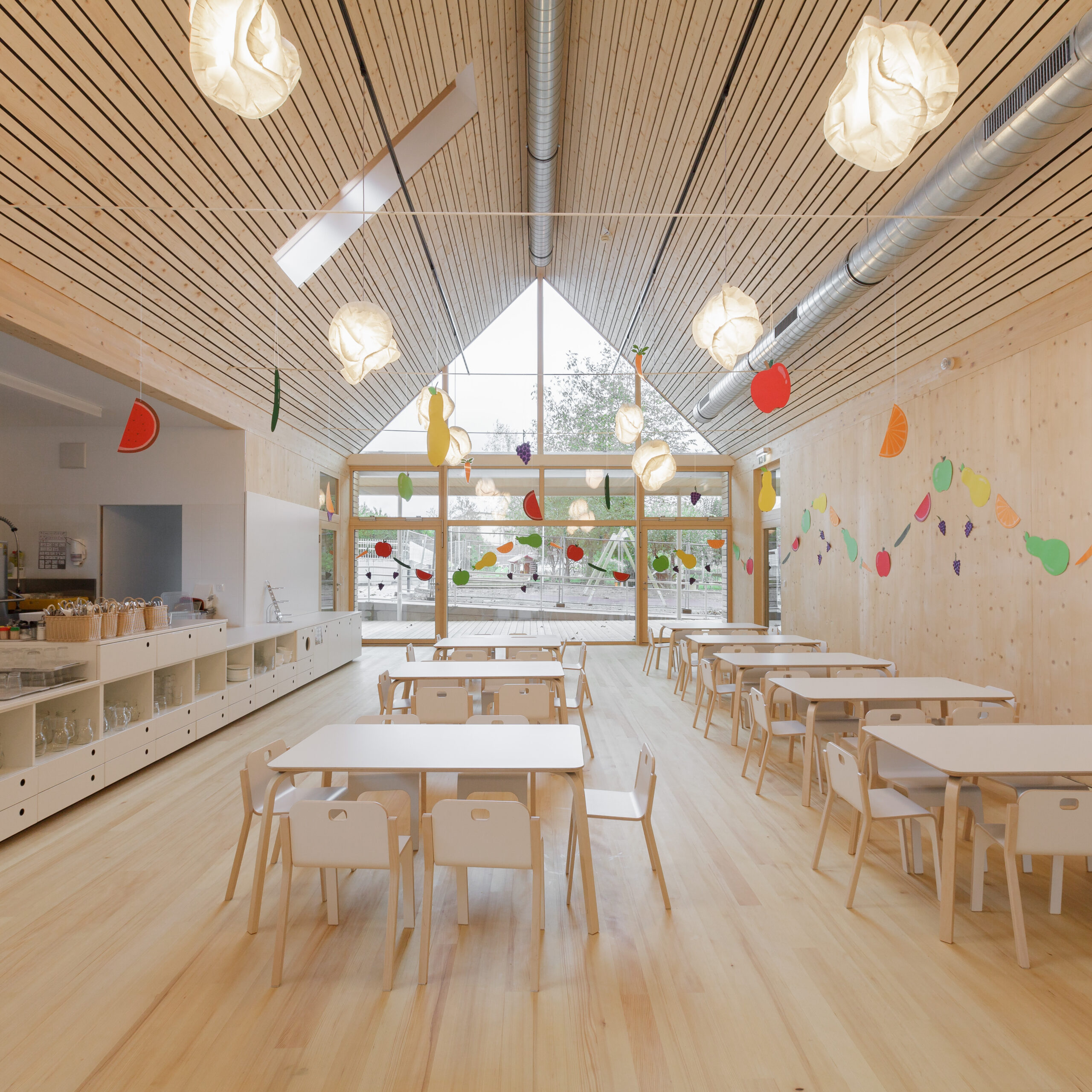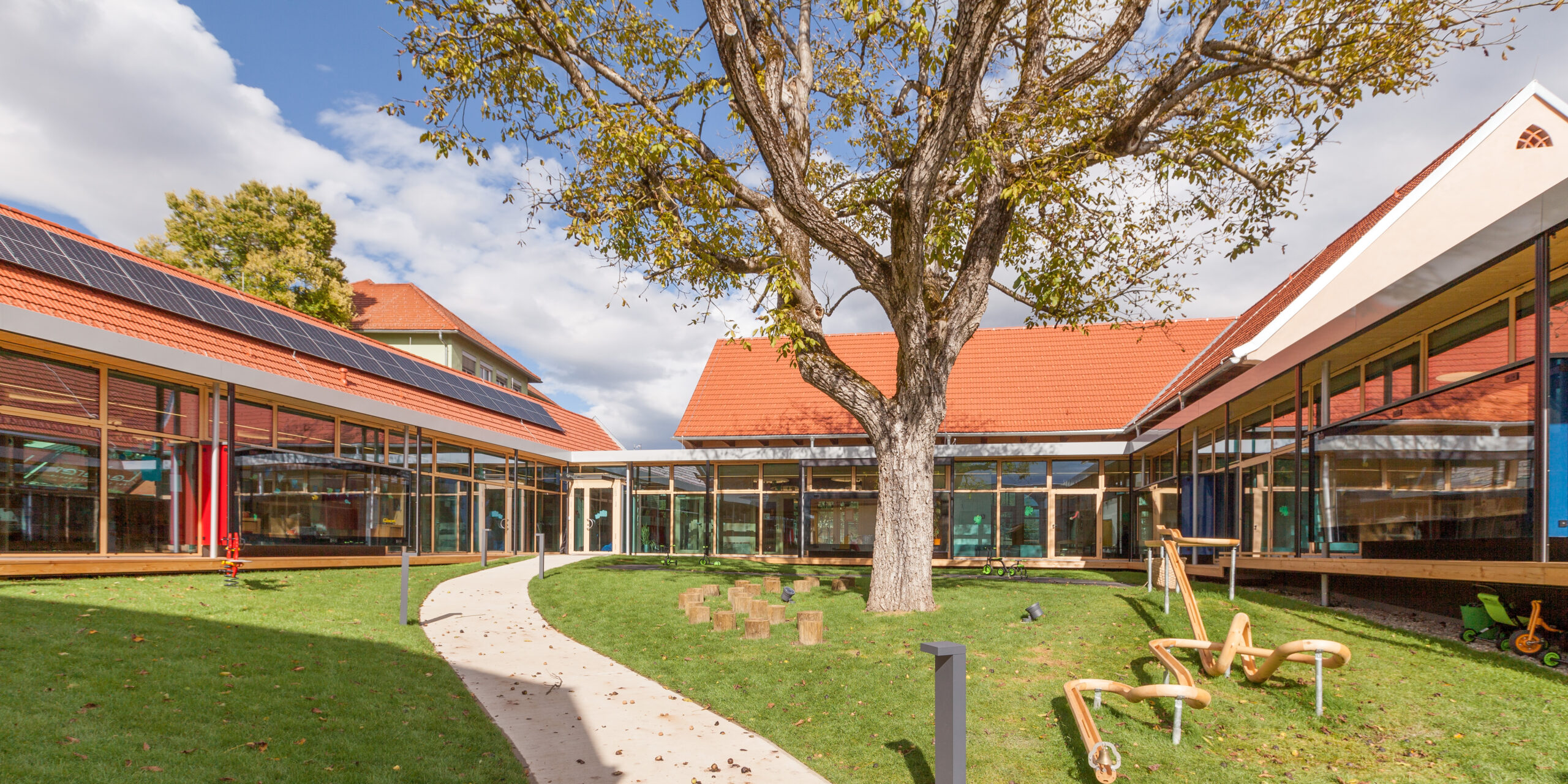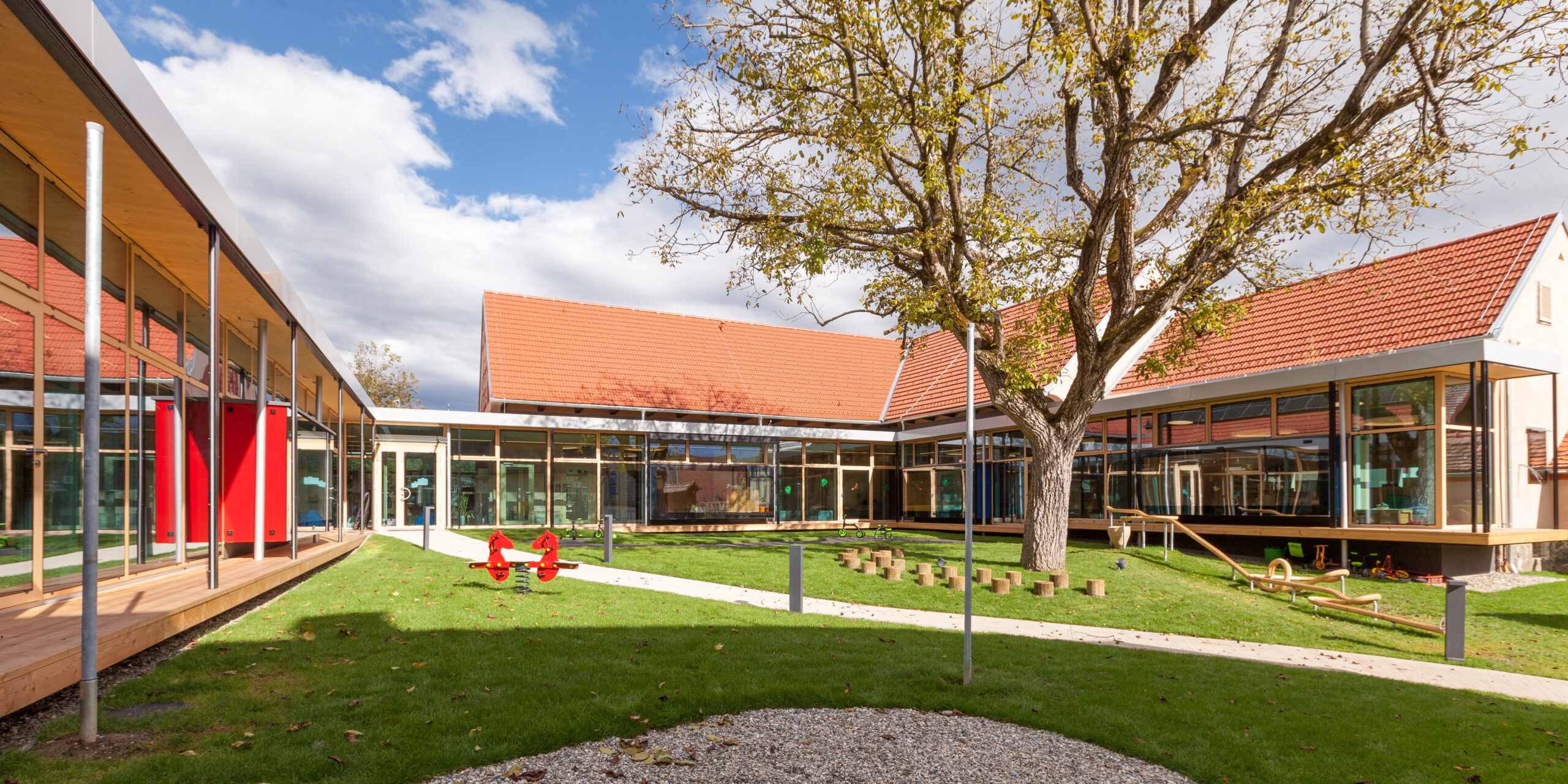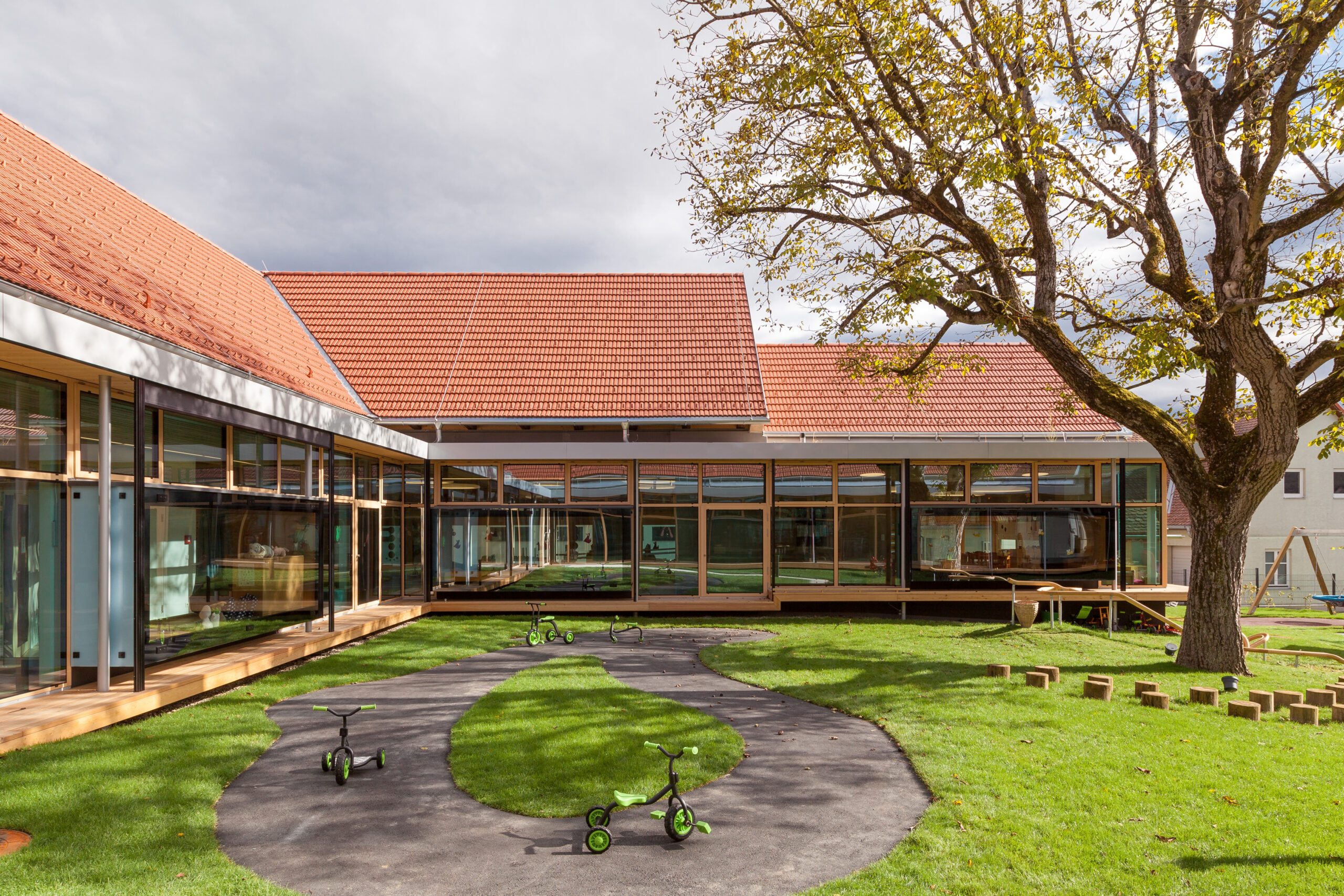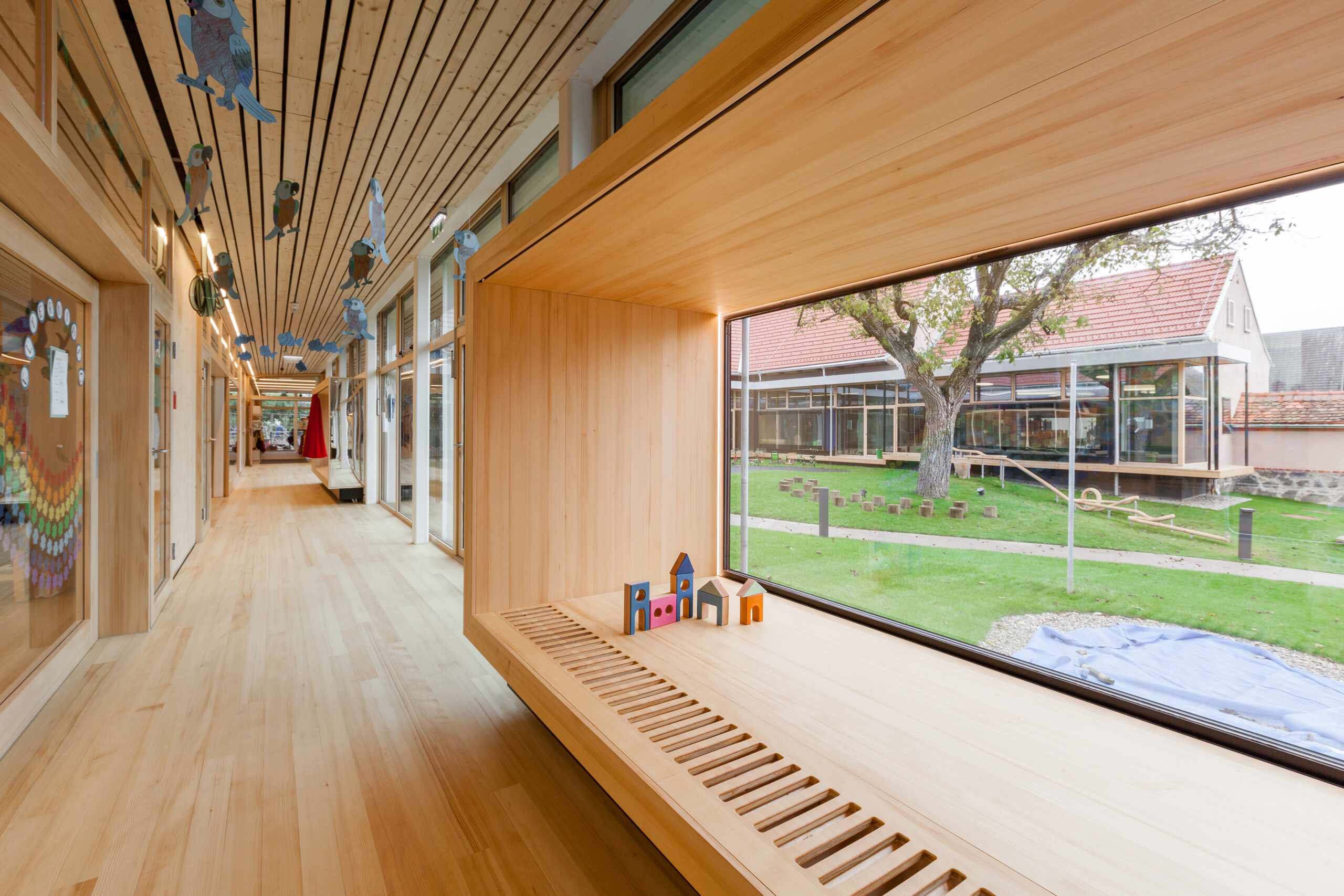 Präzise gesetzte Eingriffe schaffen vielfältige Bezüge zum Außenraum, öffnen überraschende Blickbeziehungen und fördern eine lebendige, abwechslungsreiche Nutzung. Der Kindergarten orientiert sich konsequent zum zentralen Hof, der durch den bestehenden Baum geprägt ist. Großzügige Verglasungen und sogenannte Sitzfenster schaffen Aufenthaltsqualität, ermöglichen den Blick in die Natur und fungieren zugleich als verbindendes Element zwischen Innen- und Außenraum. Da der Hof auch die fußläufige Erschließung für das Bringen und Holen der Kinder aufnimmt, entsteht eine hohe kommunikative Qualität im Alltag.