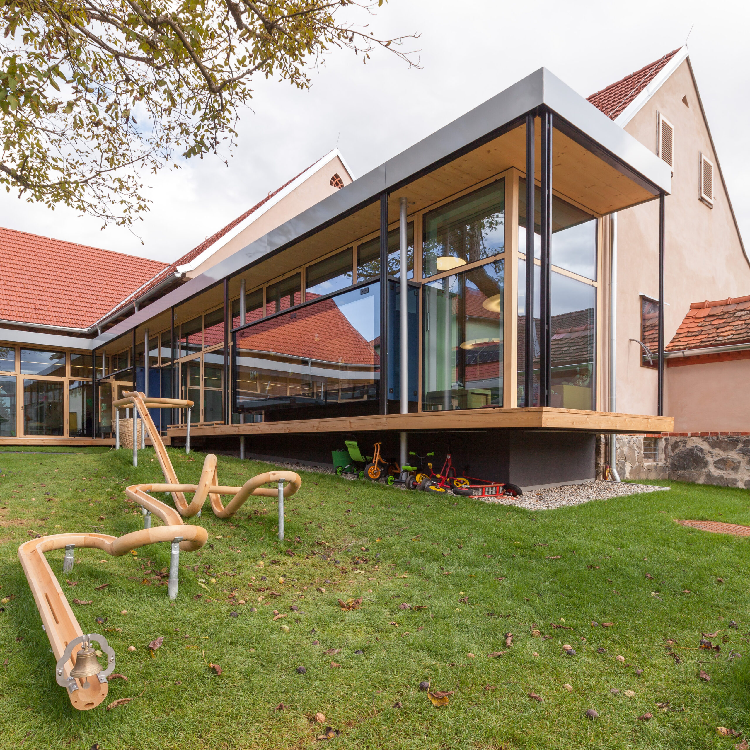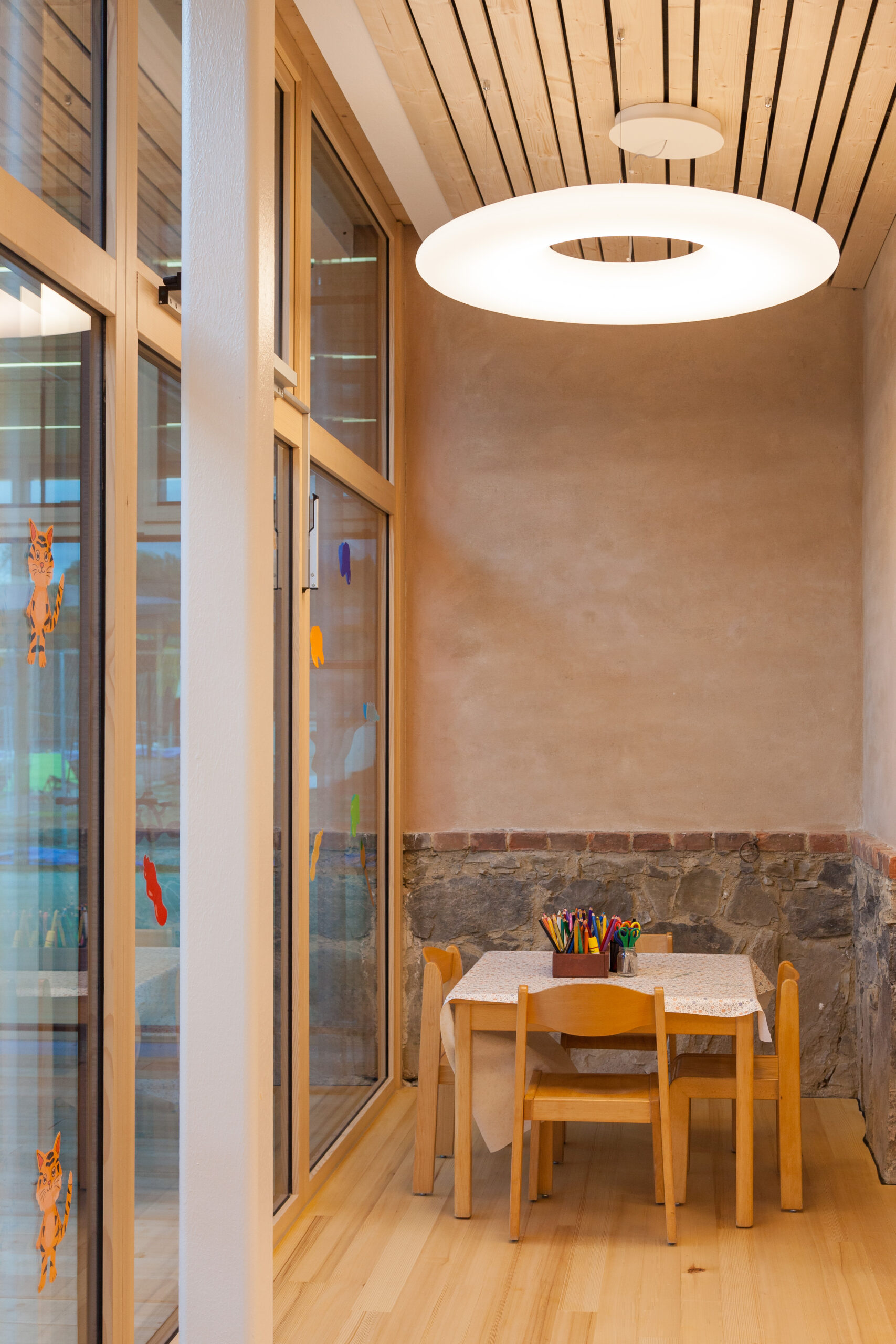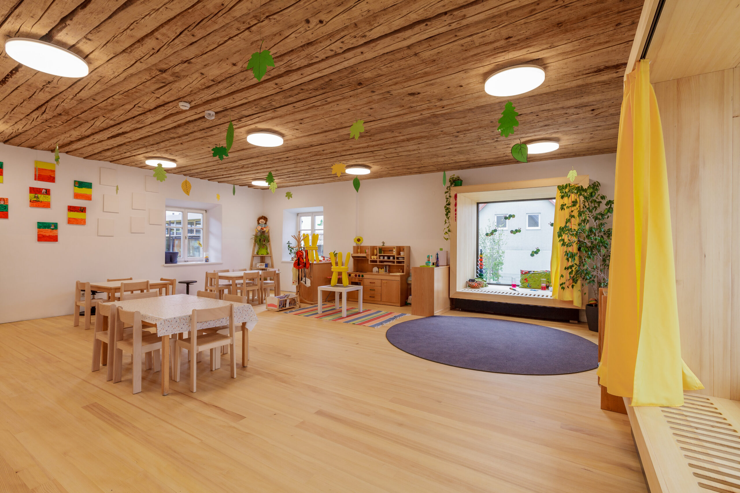 Durch die behutsame Transformation der bestehenden Strukturen, die ursprünglich nicht für eine Nutzung als Kindergarten vorgesehen waren, entsteht ein neues, funktional wie atmosphärisch stimmiges Bildungsensemble. Der Bestand bleibt dabei bewusst ablesbar und vermittelt seine rund zweihundertjährige Geschichte, die Teil der neuen Nutzung wird.
