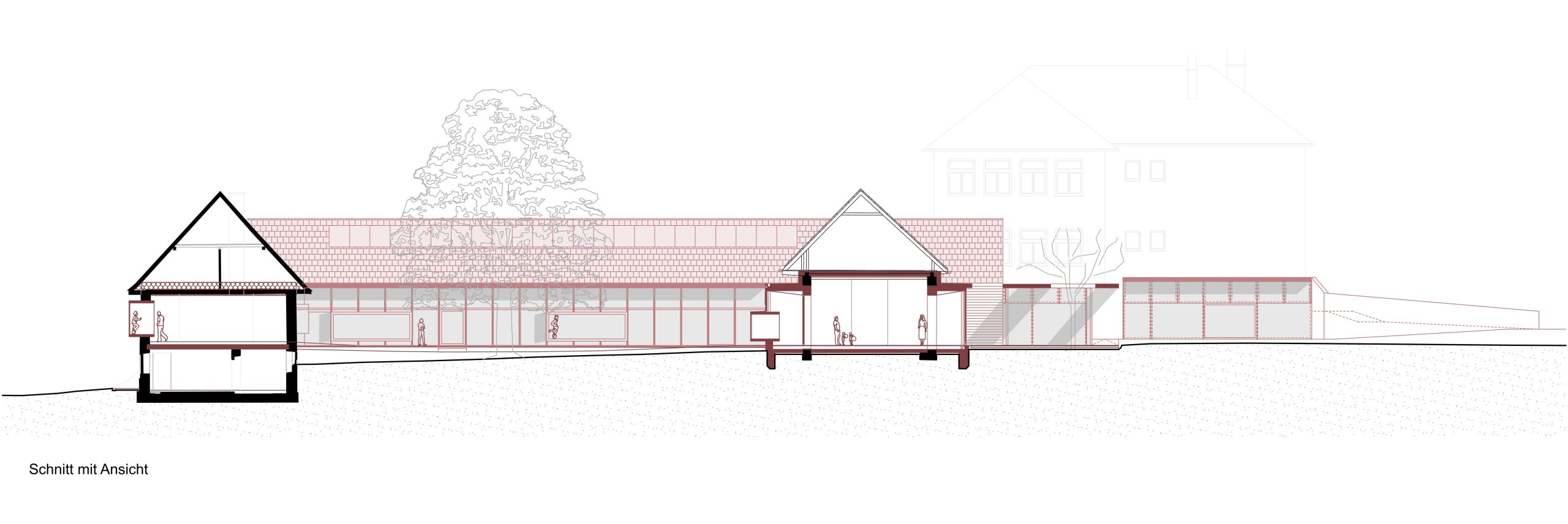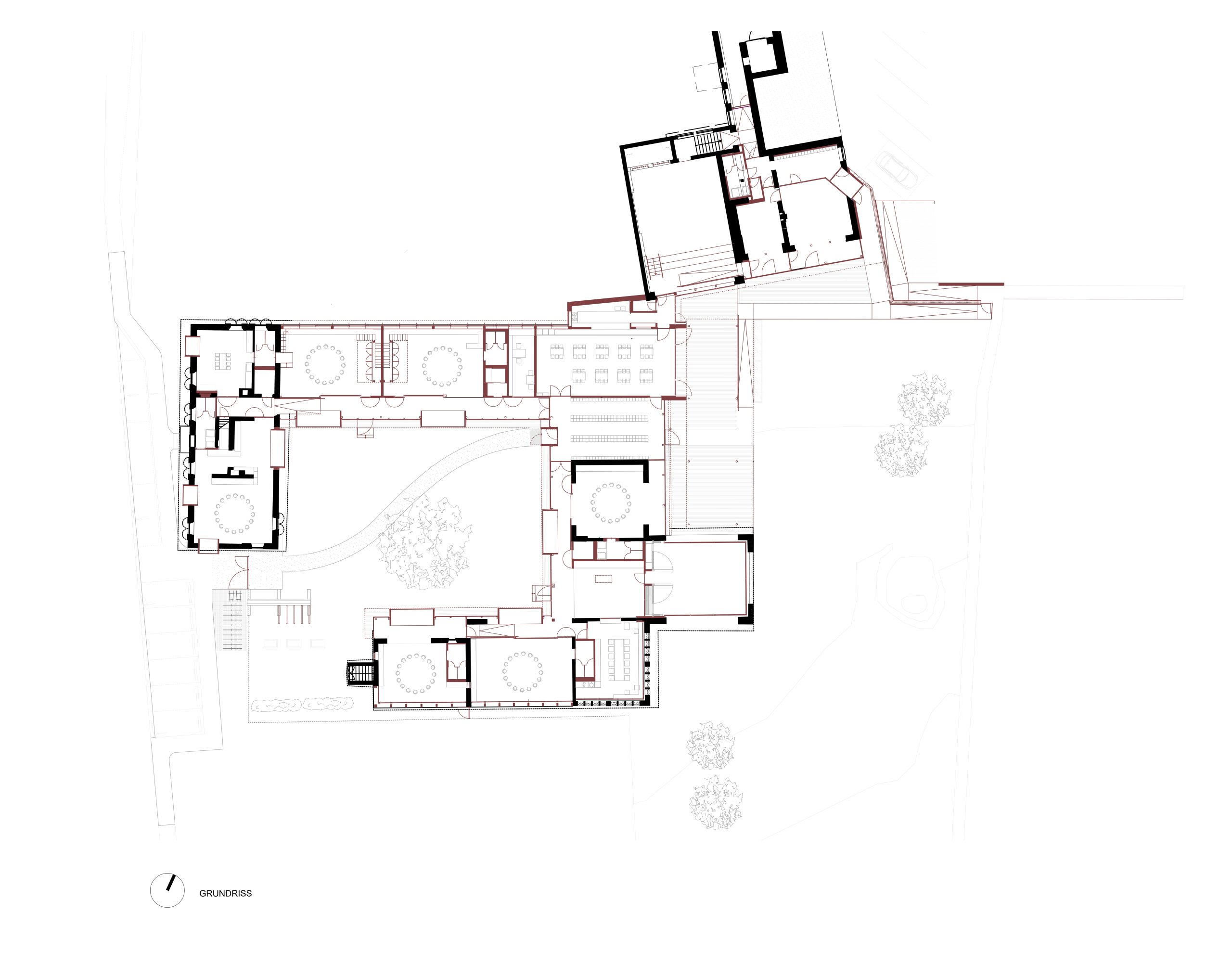 Die vorhandenen Bestandsgebäude bilden bereits eine hofartige Struktur mit einem zentralen Baum, die durch einen gezielten Zubau im Osten – mit Haupteingang, Schleuse und Garderobe – weiter gefasst und gestärkt wird. Der nördliche Baukörper, ein ehemaliges Stallgebäude, wurde aufgrund seines baulichen Zustands neu errichtet und in seiner Kubatur nach Osten erweitert. Im Westen ergänzt das ehemalige Wohnhaus „Hamlitsch“ das Ensemble.