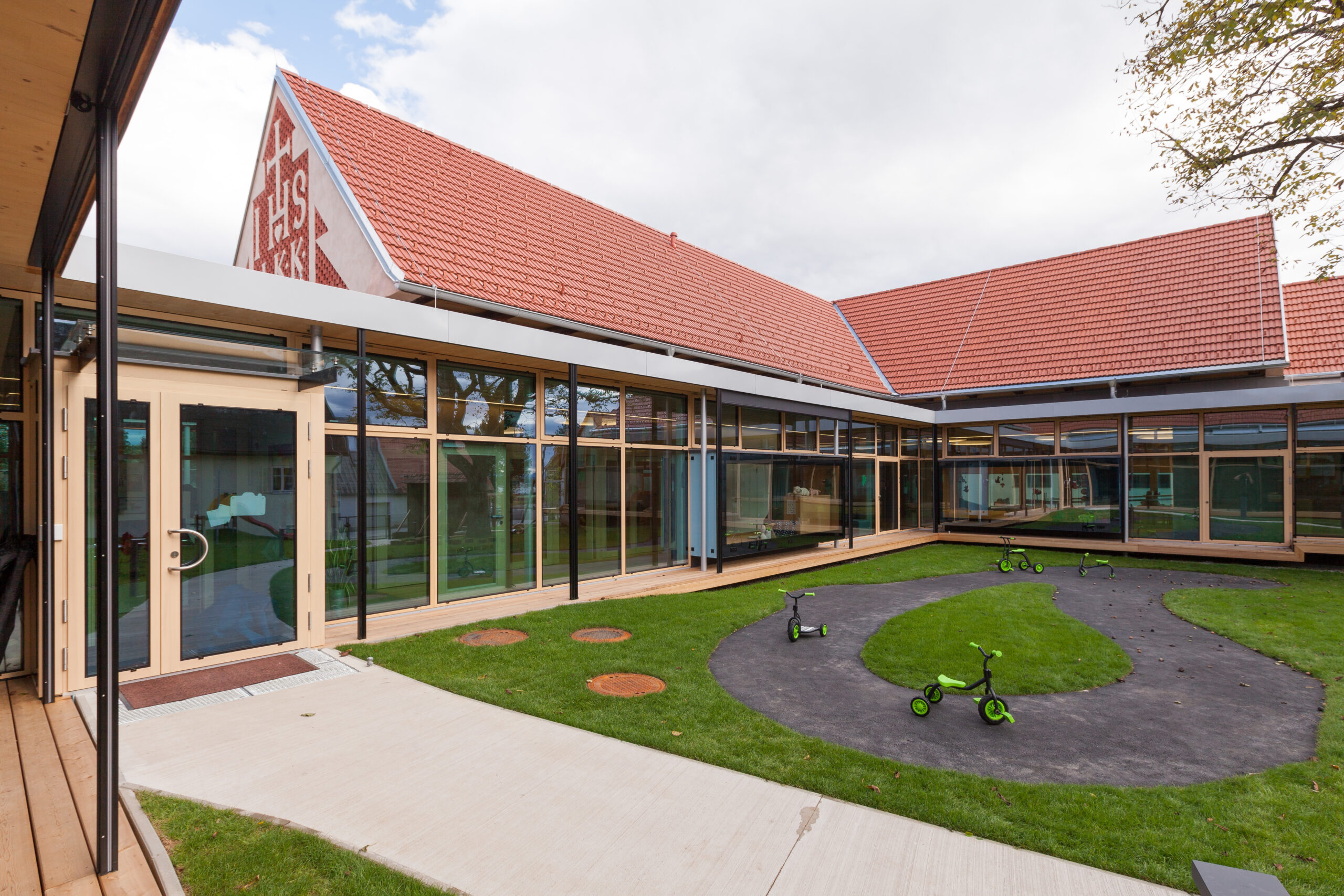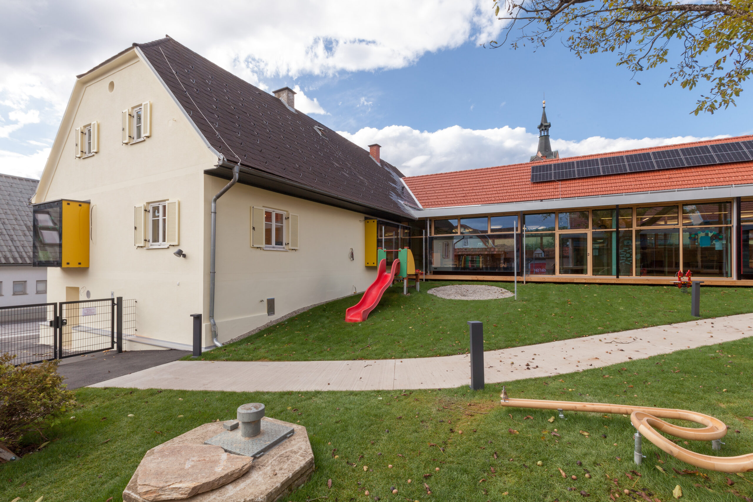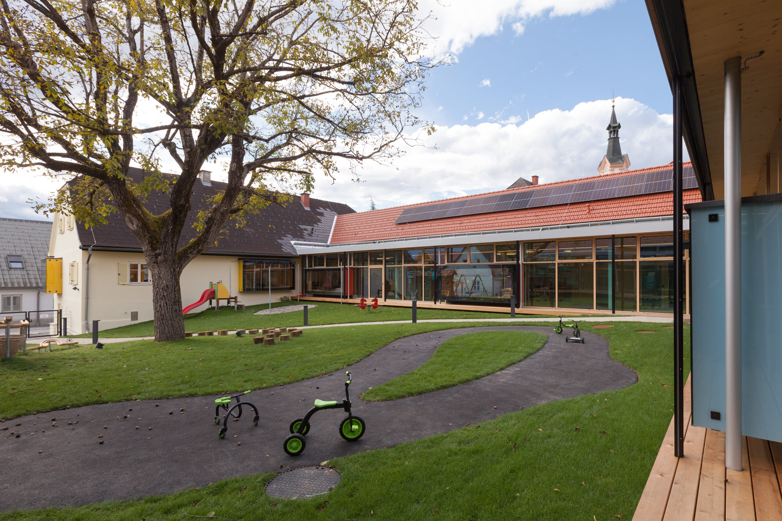 Der Spielplatz ist bewusst vom Hof getrennt auf der Rückseite des Gebäudes angeordnet und baulich klar abgegrenzt. In diesem Bereich befindet sich auch die Kinderkrippe, die im Norden des Areals im ehemaligen Untergeschoss der alten Volksschule untergebracht ist. So entsteht eine klare funktionale Gliederung zwischen den unterschiedlichen Altersgruppen.