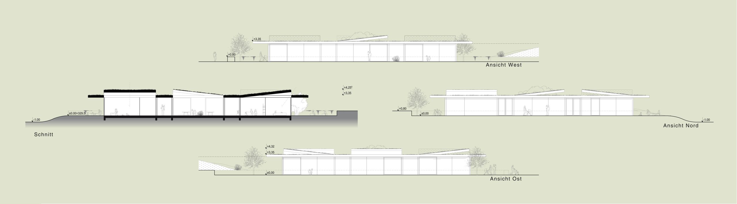 Die Dachlandschaft wird durch gezielte Öffnungen ergänzt, die zusätzliches Tageslicht in die Räume bringen und natürliche Belüftung ermöglichen. Großzügige Verglasungen stärken den Bezug zur Umgebung und unterstreichen das Konzept der „grünen Platte“. Umlaufende Vordächer sorgen für sommerlichen Sonnenschutz, während sie im Winter den Eintrag von tief stehender Sonne ermöglichen.