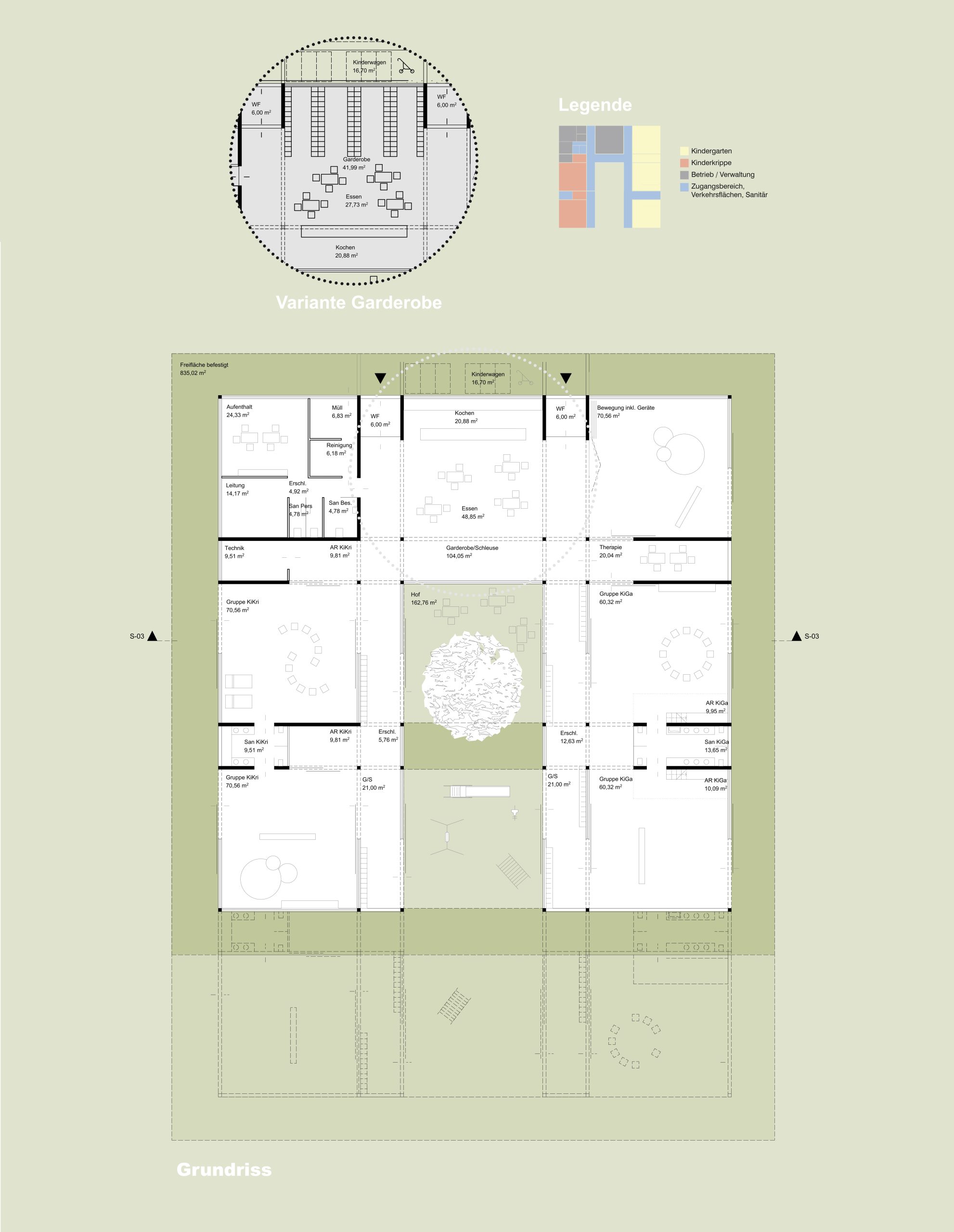 Die Erschließung erfolgt von Nordosten getrennt für Kindergarten und Krabbelstube. Nach dem Eintritt über die Windfänge gelangt man in den zentralen Bereich mit Verwaltung, Essenszone und Bewegungsraum. Die Garderoben sind direkt vor den Gruppenräumen angeordnet und bilden den Übergang zum Hof. Diese Positionierung ermöglicht kurze Wege und eine unmittelbare Verbindung zwischen Innen- und Außenraum.