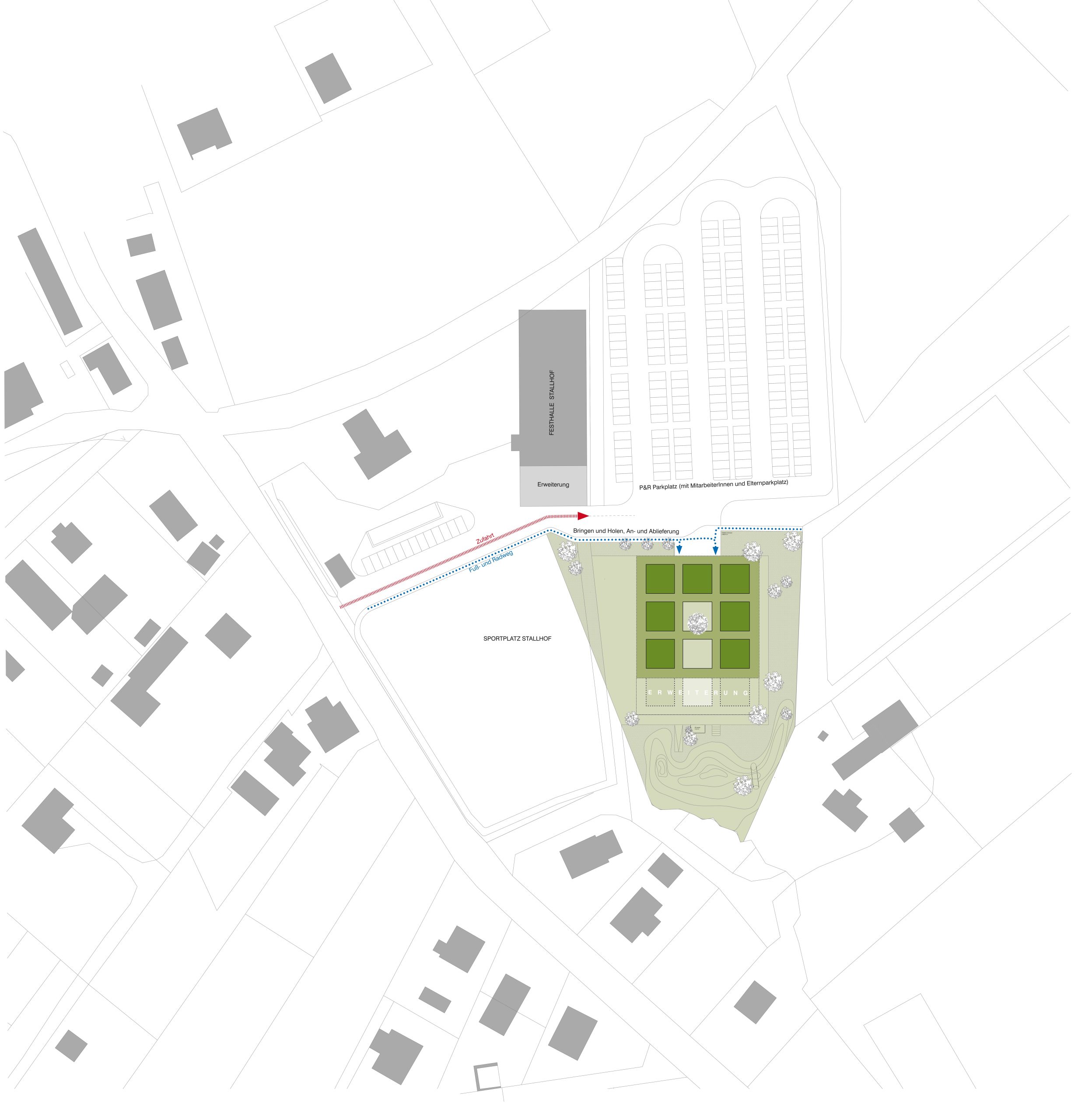 Die funktionale Aufgabe umfasst die Errichtung einer Kinderbetreuungseinrichtung mit drei Kindergarten- und drei Krabbelstubengruppen. Zentrale Anforderungen sind der direkte, ebenerdige Zugang zu den Außenräumen sowie die gleichzeitige Integration einer Park&Ride-Anlage im nördlichen Bereich des Grundstücks.