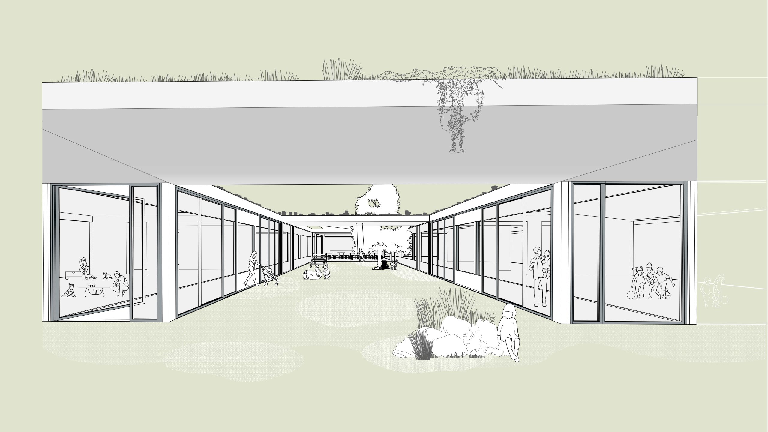 Das Gebäude wird bewusst in die Landschaft eingebettet und teilweise abgesenkt. Dadurch entsteht ein geschützter, geborgener Außenraum, der zunächst als eingeschnittener Bereich wahrgenommen wird und sich in weiterer Folge nach Süden hin zu einem offenen Spielbereich erweitert. Das Aushubmaterial wird in Form eines Spielhügels wieder in die Gestaltung integriert. Gleichzeitig wird die versiegelte Fläche durch eine begrünte Dachlandschaft kompensiert, die als Retentionsfläche, Gründach und Träger für solare Energiegewinnung dient.