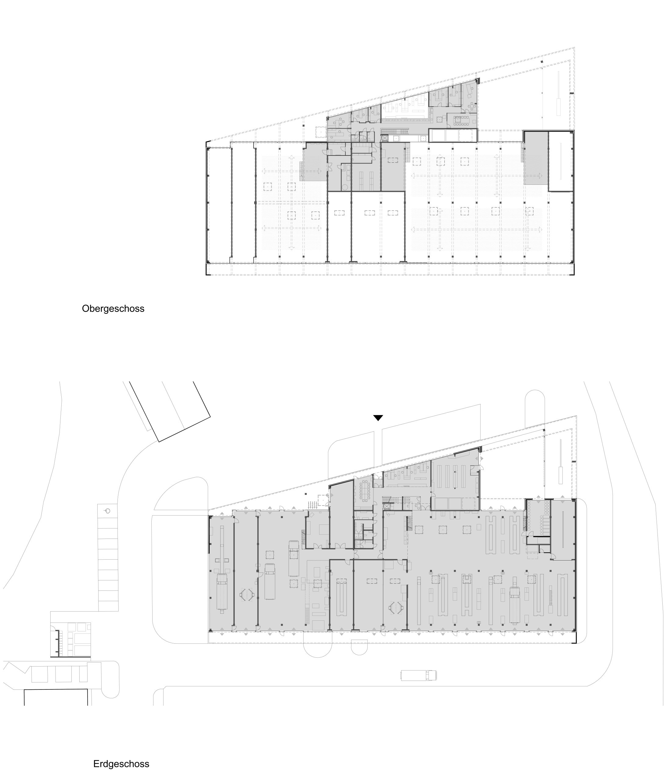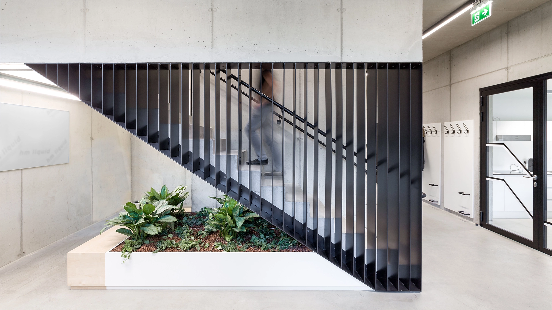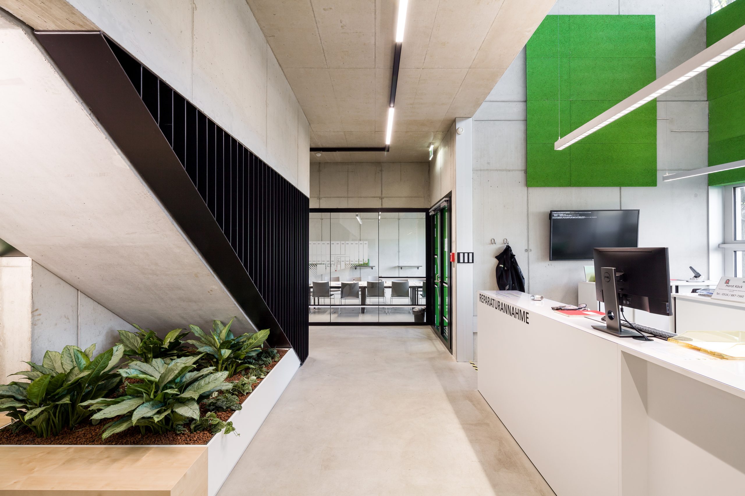 Funktional folgt das Gebäude einer logischen Abfolge: Werkstätten, Lager und Disposition sind direkt miteinander verknüpft und ermöglichen kurze Wege sowie effiziente Prozesse. Ein zweigeschossiger Mitteltrakt verbindet die Produktionsbereiche mit den Büroflächen und fördert durch offene Sichtbeziehungen und transparente Strukturen die Kommunikation zwischen Werkstatt und Verwaltung.
