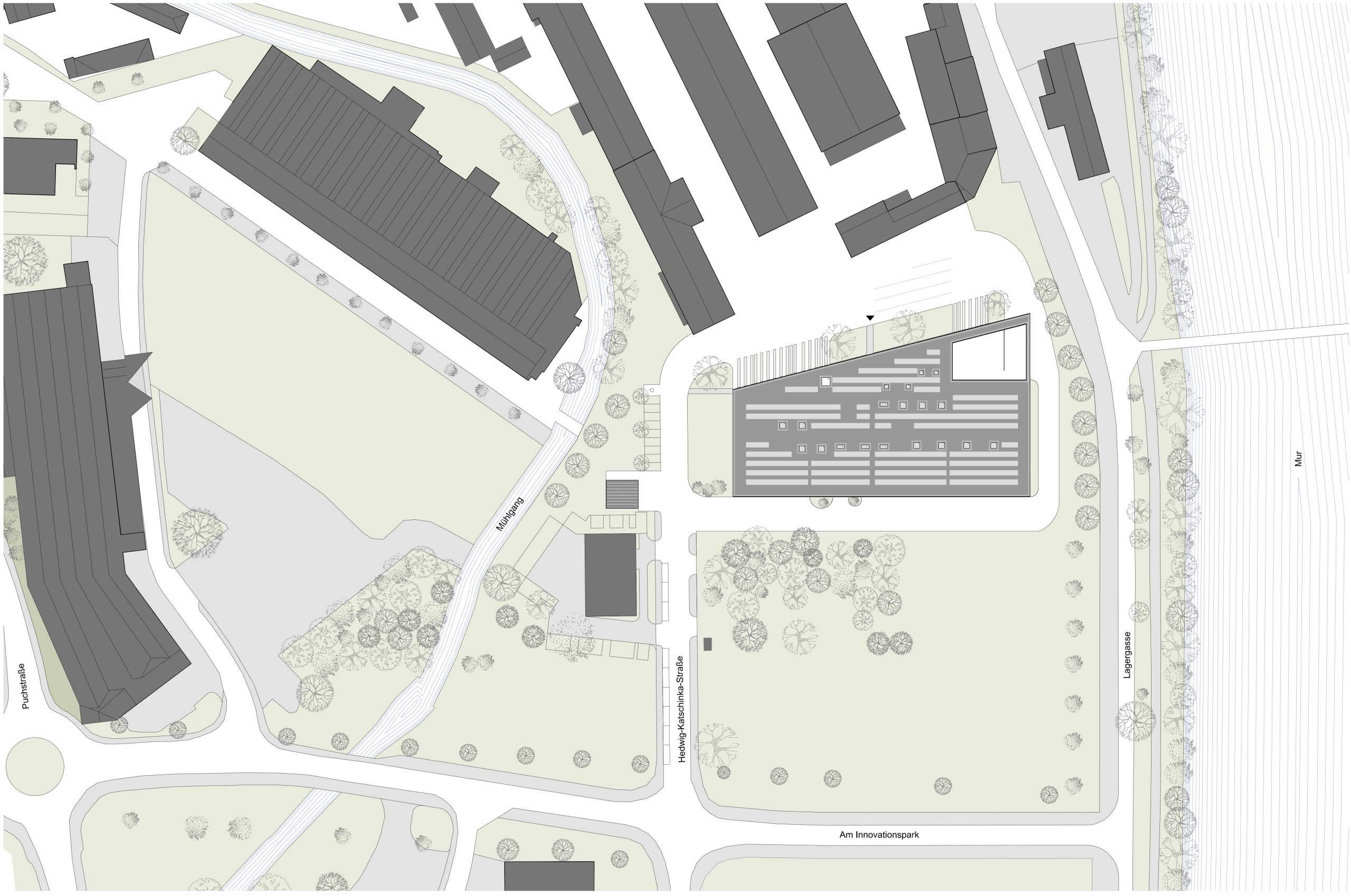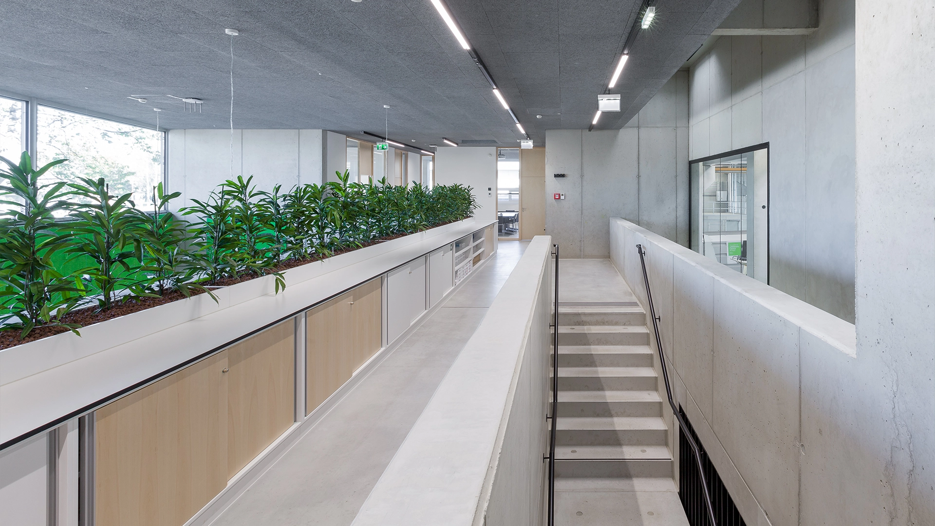 Das Projekt setzt konsequent auf Nachhaltigkeit und Energieeffizienz: Eine hochgedämmte Gebäudehülle, Bauteilaktivierung und Fußbodenheizung gewährleisten einen ressourcenschonenden Betrieb. Natürliche Lüftung, Nachtkühlung und außenliegender Sonnenschutz verbessern das sommerliche Raumklima. Extensive Dachbegrünung und eine großflächige Photovoltaikanlage leisten zusätzliche Beiträge zur ökologischen Performance.