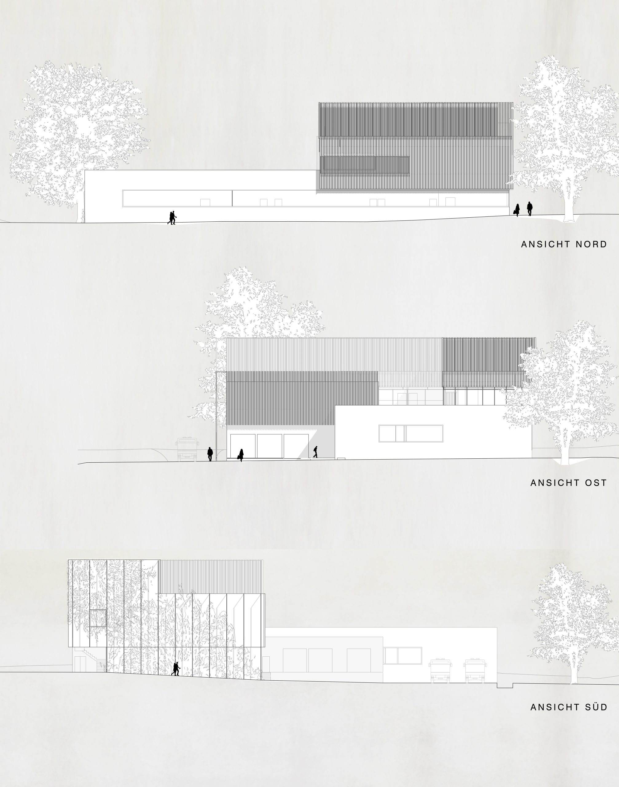 Der vorhandene Geländesprung wird funktional genutzt und ermöglicht eine effiziente Organisation der An- und Ablieferung. Dadurch liegt das Erdgeschoss nahezu auf Straßenniveau und kann ohne größere Erdbewegungen umgesetzt werden.