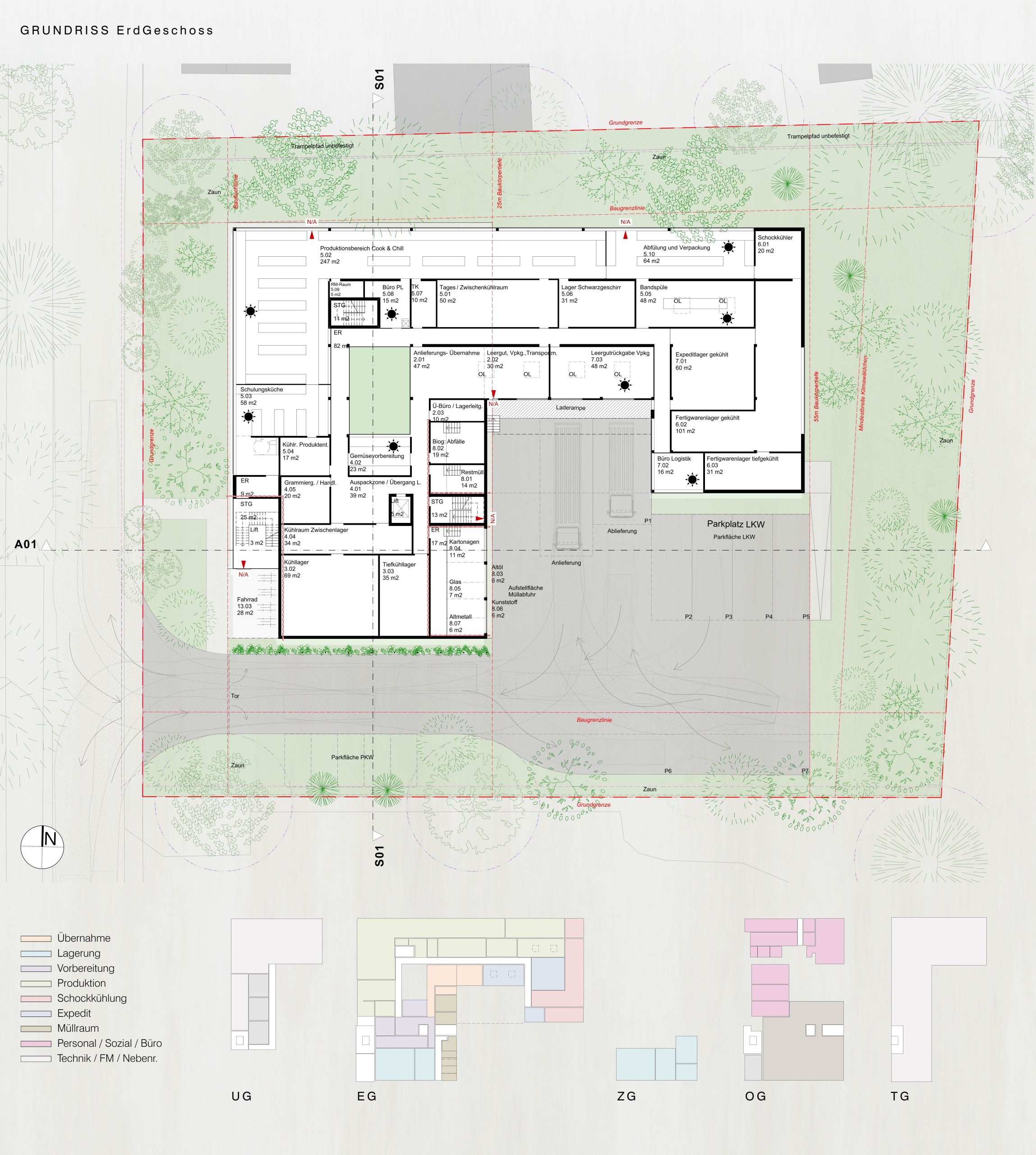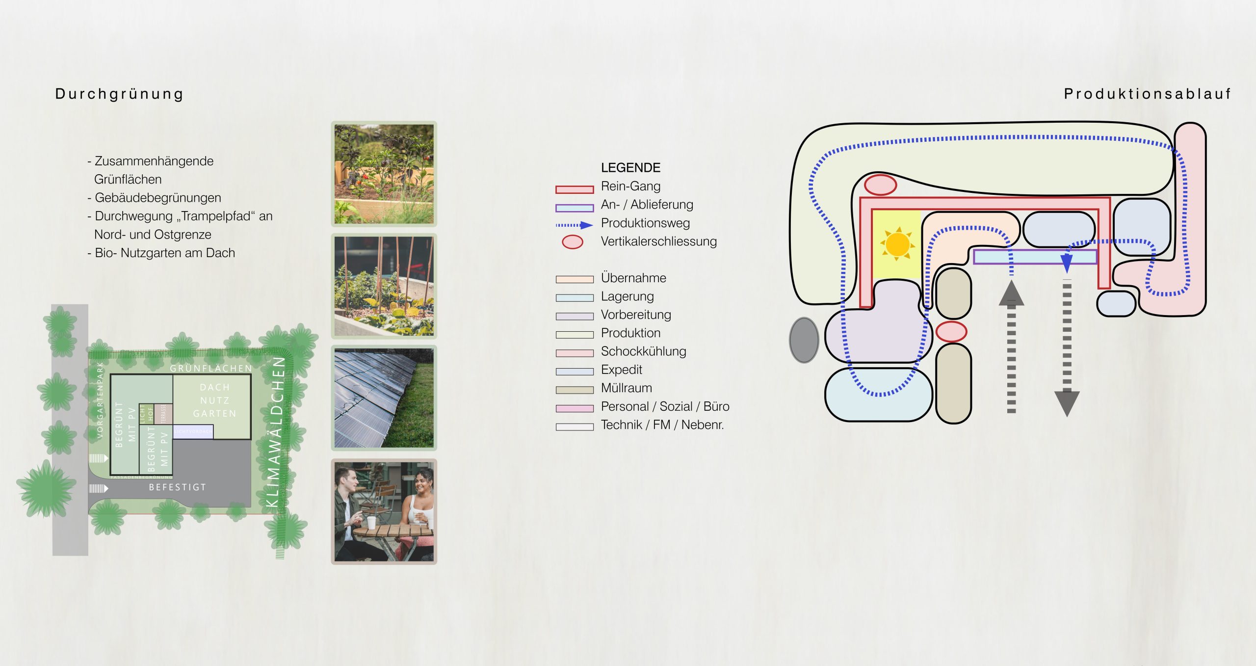 Das Projekt entsteht in einem Umfeld, das von gewerblicher Nutzung, ausgedehnten Brachflächen und wertvollen Grünräumen geprägt ist. In Fortführung einer zuvor extensiven kulturellen Nutzung wird an diesem Standort die zentrale Küche der Stadt Graz verortet. Ziel des städtebaulichen Konzepts ist es, Verkehrsflächen möglichst effizient einzusetzen und gleichzeitig großzügige, zusammenhängende Grünräume zu bewahren.