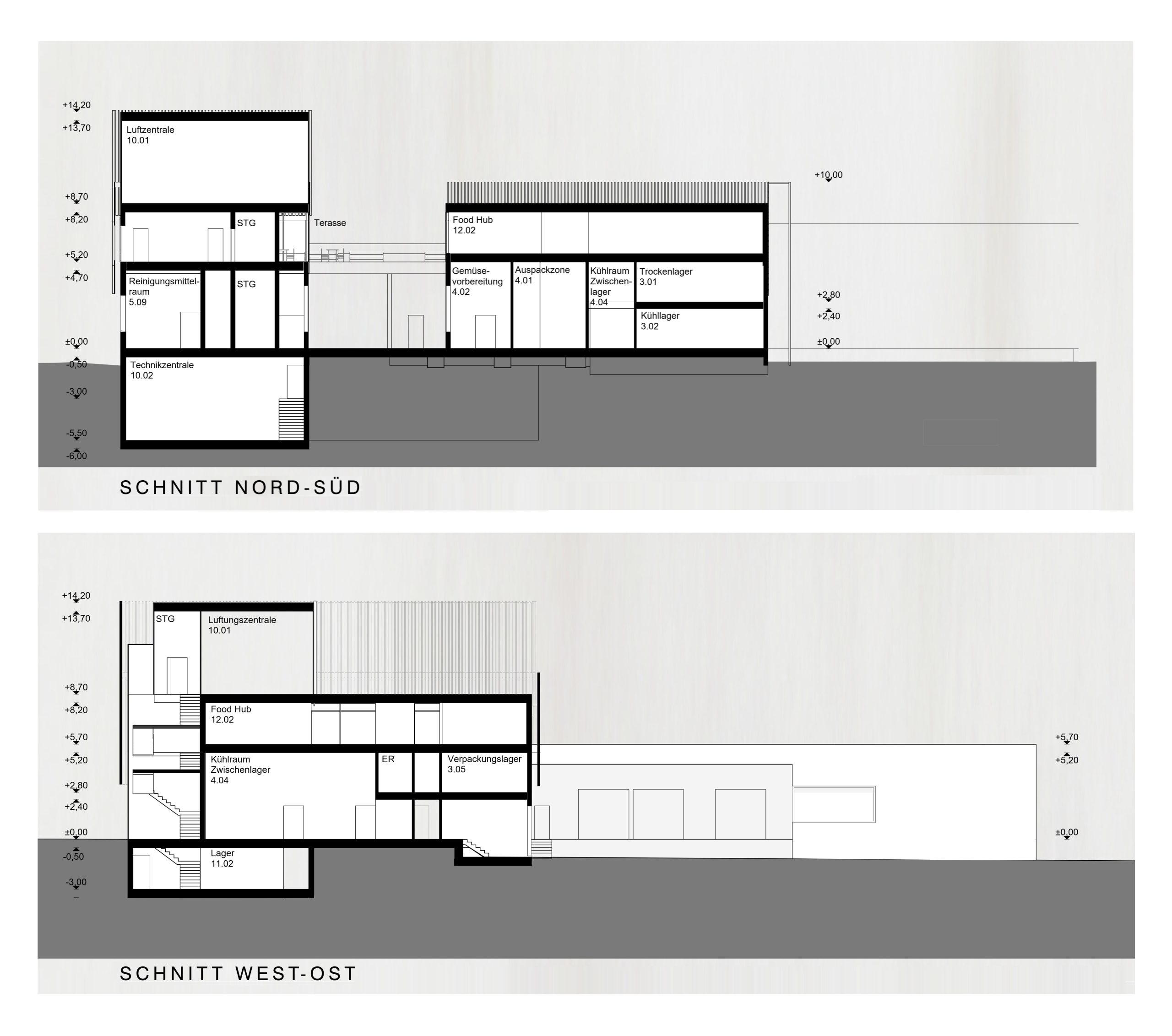 Im Obergeschoss befinden sich Verwaltung, Speisesaal sowie Hygienebereiche für Mitarbeitende, die über ein eigenes Stiegenhaus mit dem Erdgeschoss verbunden sind. Die Schauküche sowie Bereiche für Produktentwicklung ermöglichen zusätzlich Einblicke für Besucher:innen und Schulklassen. Auch der Speisesaal sowie der angrenzende Biogarten können für Bildungs- und Vermittlungszwecke genutzt werden. Eine barrierefreie Anbindung der Schauküche erlaubt zudem eine direkte Integration in den Küchenbetrieb.