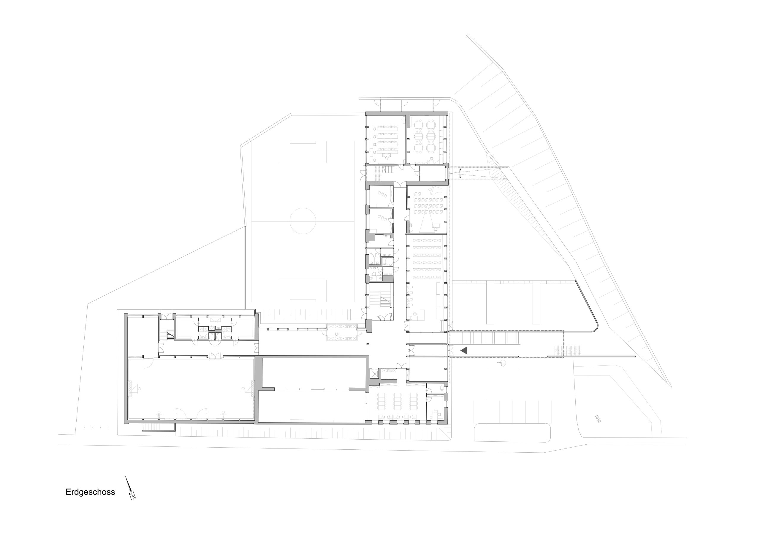 Die innere Organisation folgt einer logischen Stockwerksaufteilung: Die Volksschule im 1. Obergeschoss, die Neue Mittelschule im 2. Obergeschoss und die gemeinsam genutzten Verwaltungs- und Unterrichtsflächen im Erdgeschoss. Besonderes Augenmerk wurde auf die eigenständige Erschließung der Schultypen gelegt, die auch in den Fassaden und Zugangsbereichen sichtbar wird. Kellerräume wurden geöffnet, mit neuen Belichtungsflächen versehen und für Sport- sowie Ensembleunterricht nutzbar gemacht, wodurch wertvolle Nutzflächen hinzugewonnen wurden.