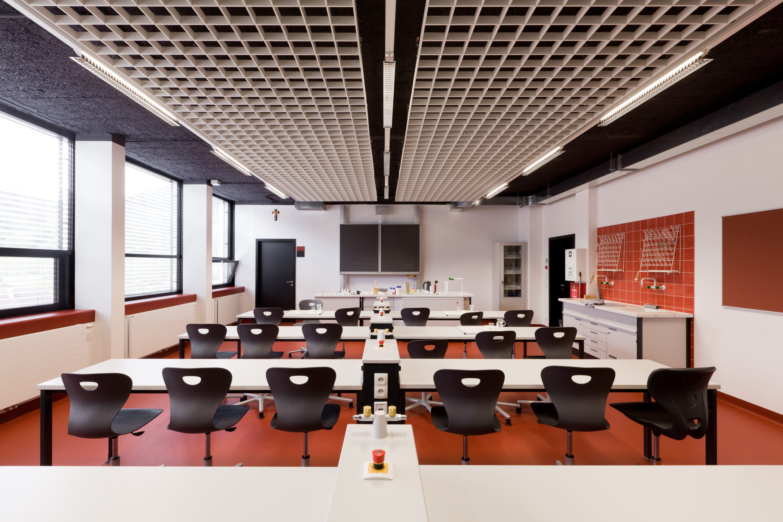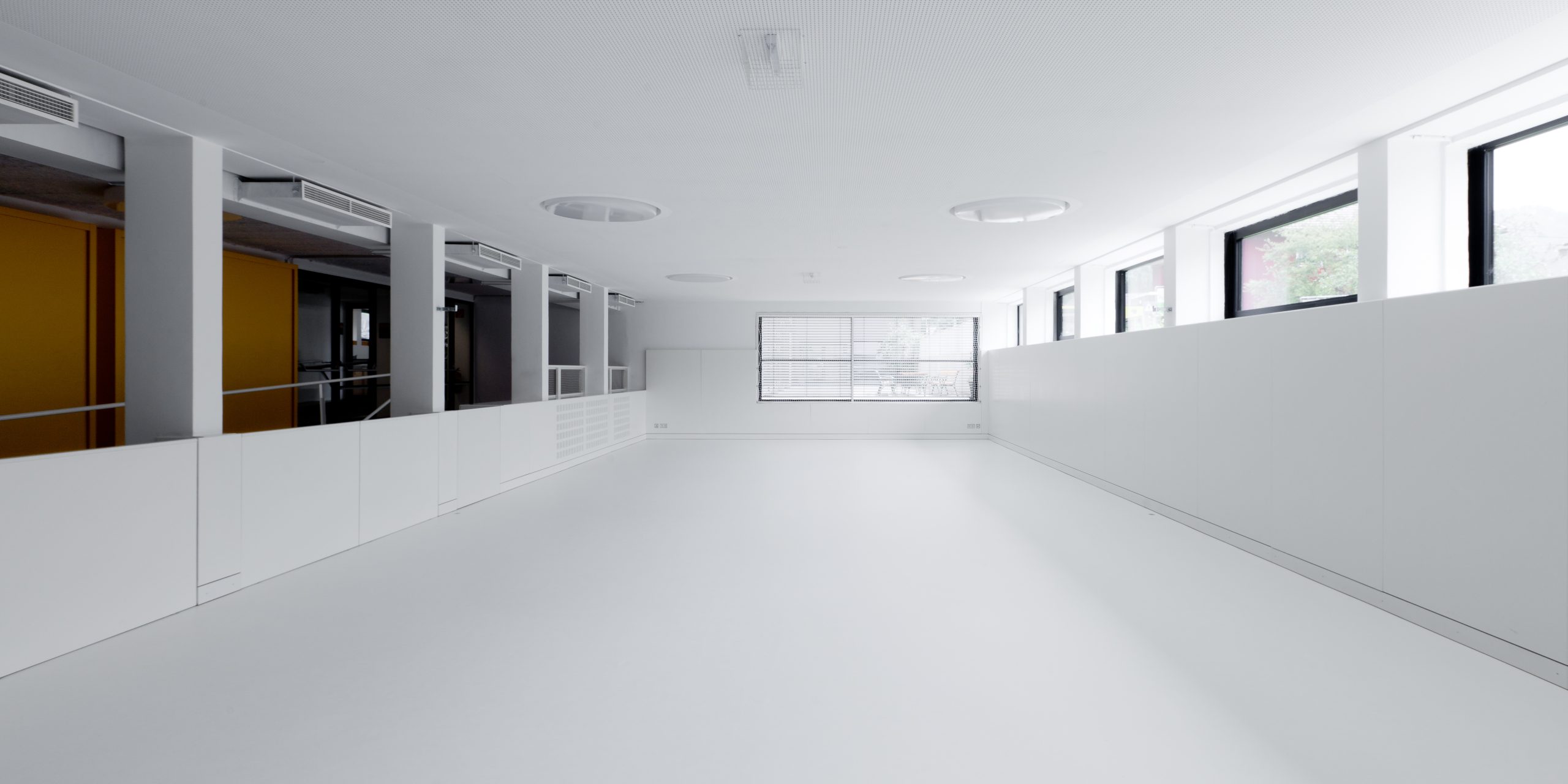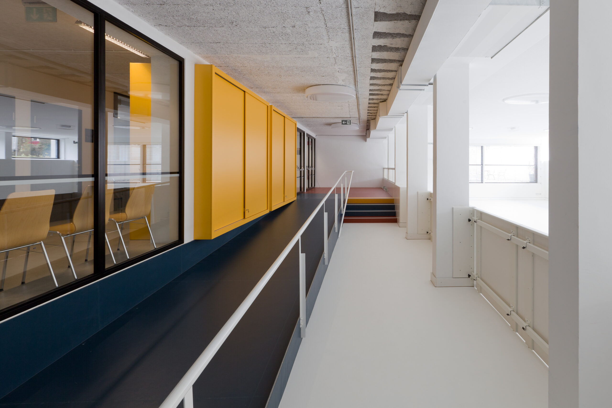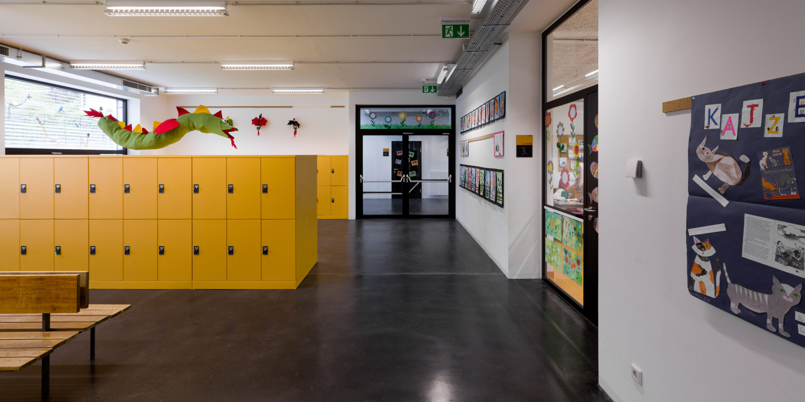 Architektonisch wurde die Großzügigkeit des einhüftigen Klassentraktes bewahrt. Die Öffnung der Flure und Klassenräume schafft neue Sichtbeziehungen und eine Verbindung zwischen Erd- und Untergeschoss. Energetische Sanierungen und der Einbau einer zentralen Lüftungsanlage senken den Gesamtenergiebedarf auf ein Fünftel des ursprünglichen Verbrauchs. Damit dient das Projekt als Mustersanierung und zeigt, wie Bestand, Funktionalität und moderne Standards harmonisch kombiniert werden können.