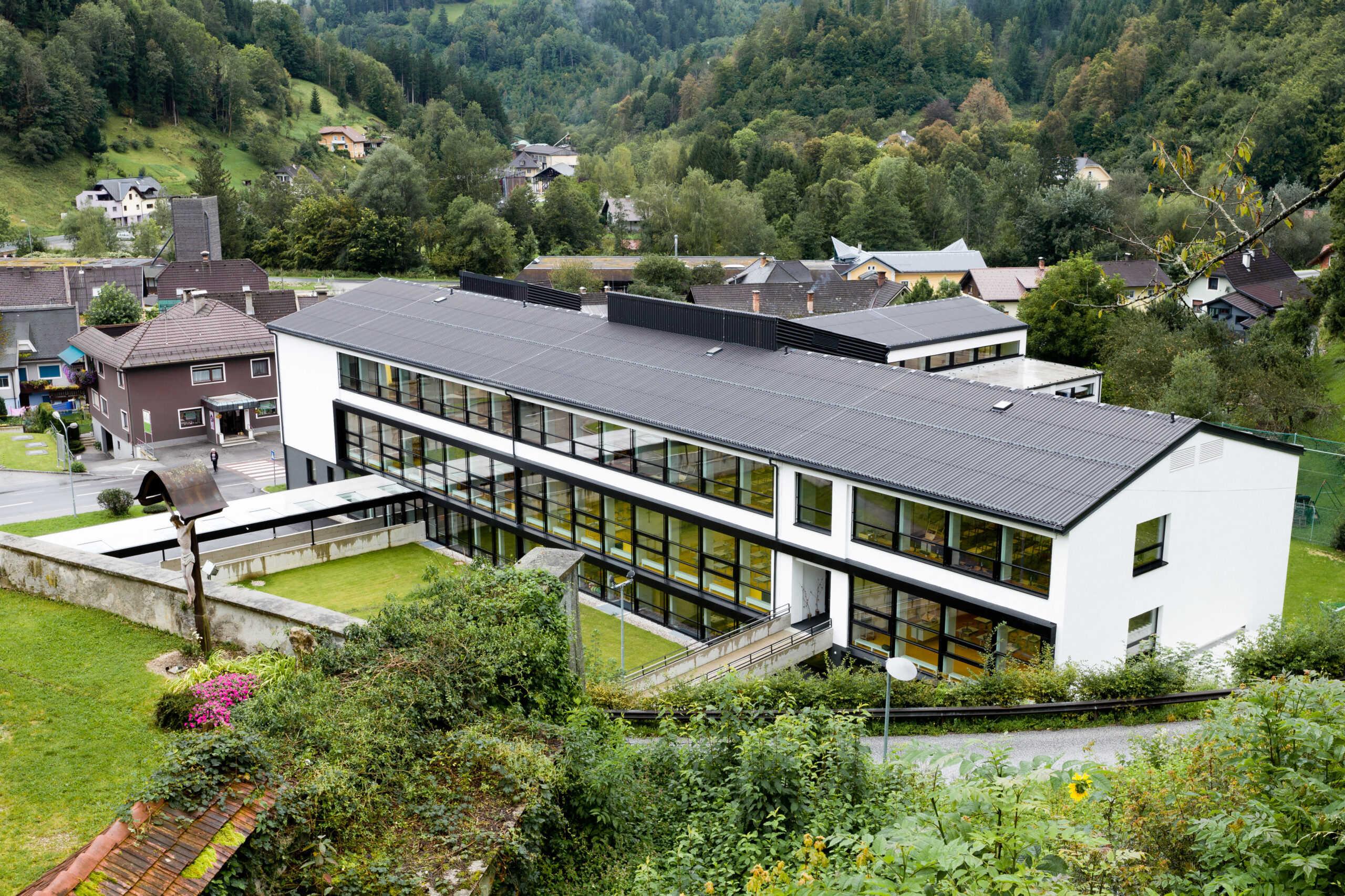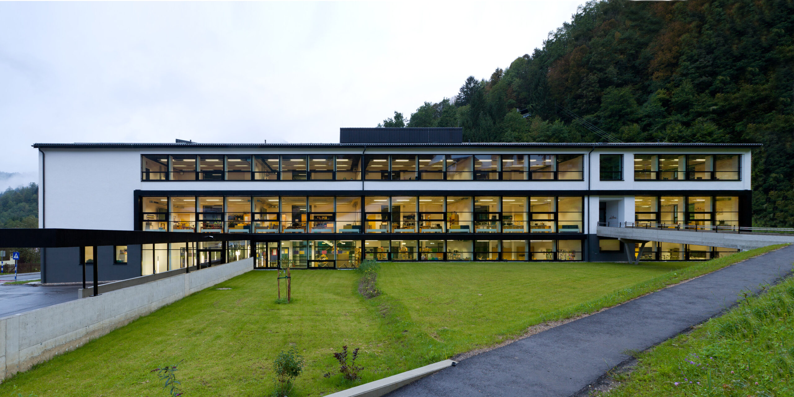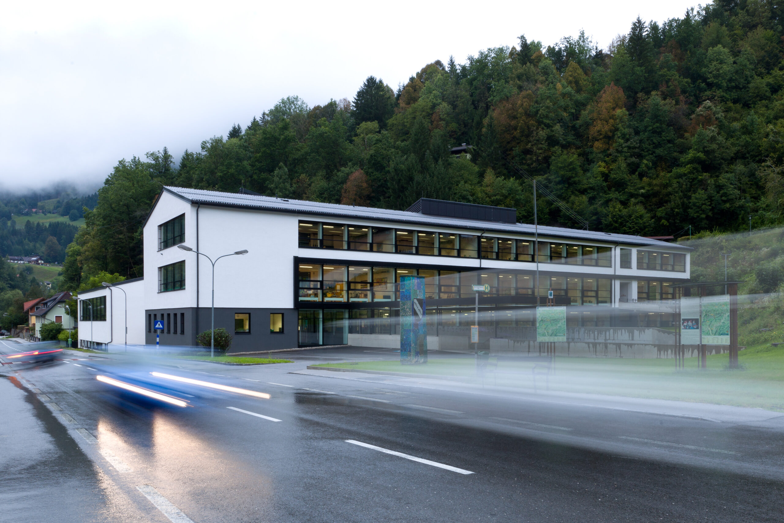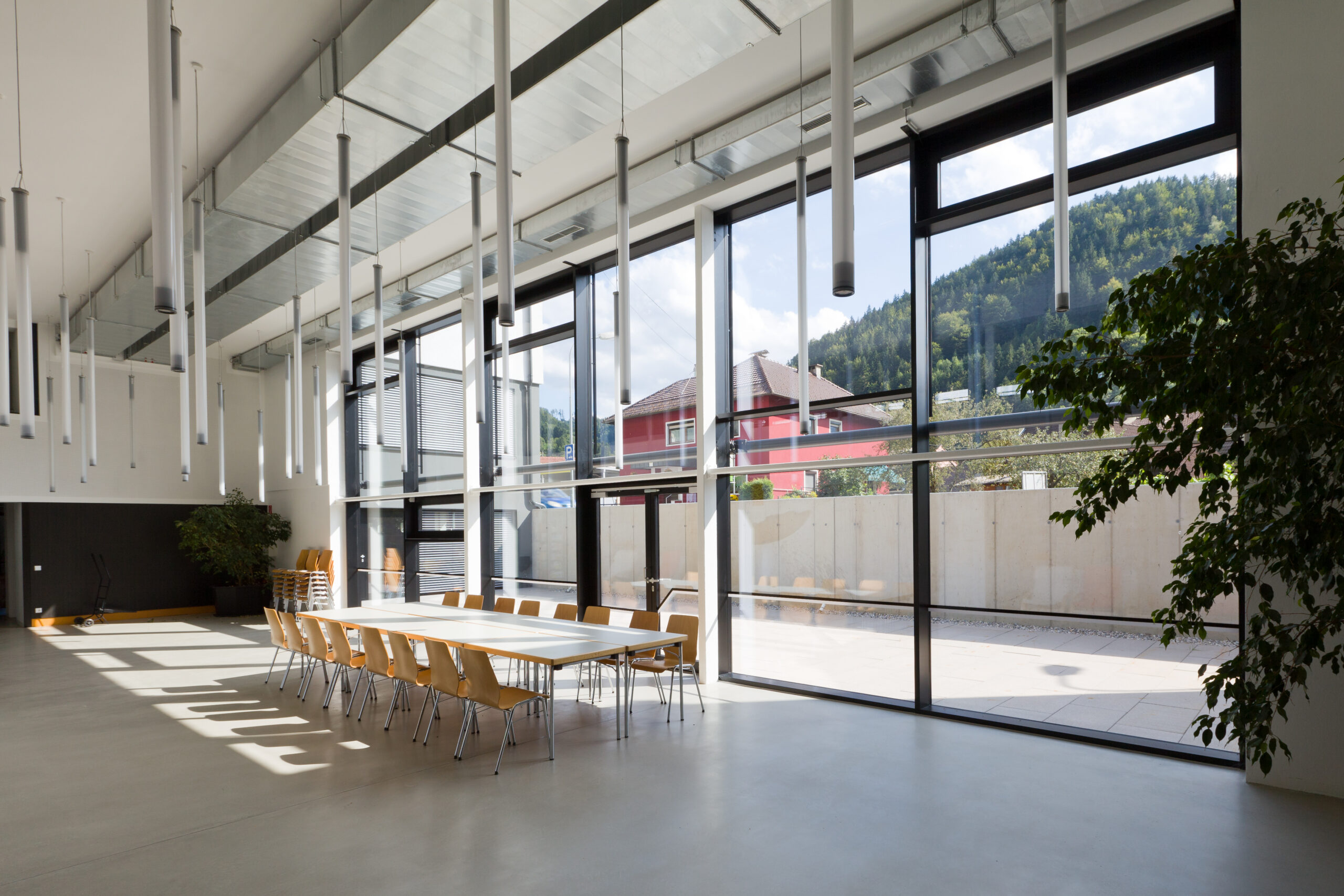 Das Bildungszentrum vereint die Volksschule, die Neue Mittelschule und die Musikschule unter einem Dach und setzt dabei auf klare, eigenständige Strukturen für jeden Schultyp. Das bestehende Schulgebäude aus den späten 1960er Jahren wurde in seiner Großzügigkeit erhalten und durch gezielte Öffnungen und Belichtungsmaßnahmen den neuen Anforderungen angepasst. Die Herausforderung bestand darin, drei unterschiedliche Schultypen innerhalb der bestehenden Struktur unterzubringen, ohne zusätzlichen Baukörper zu errichten, und gleichzeitig moderne Unterrichtsformen zu ermöglichen.