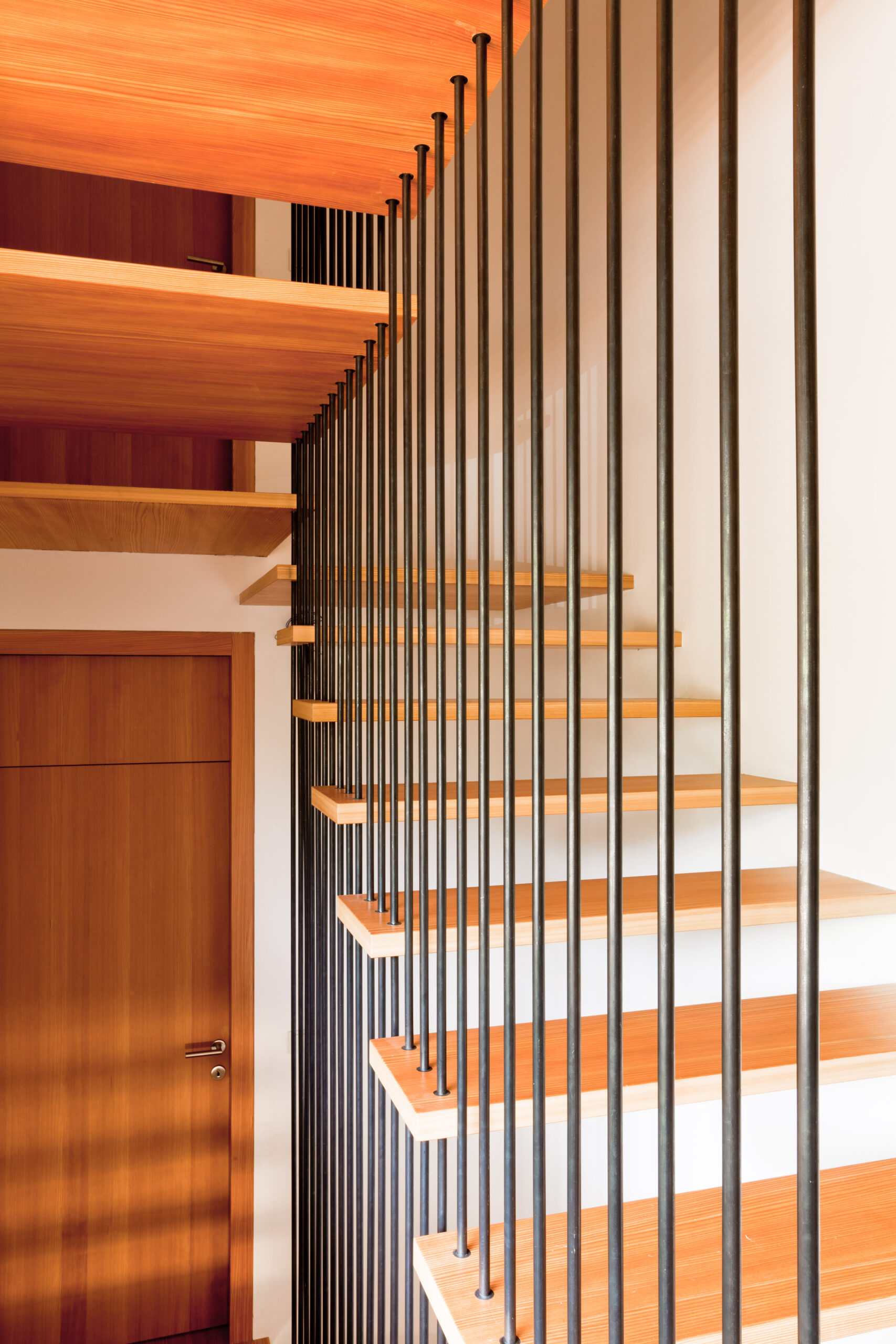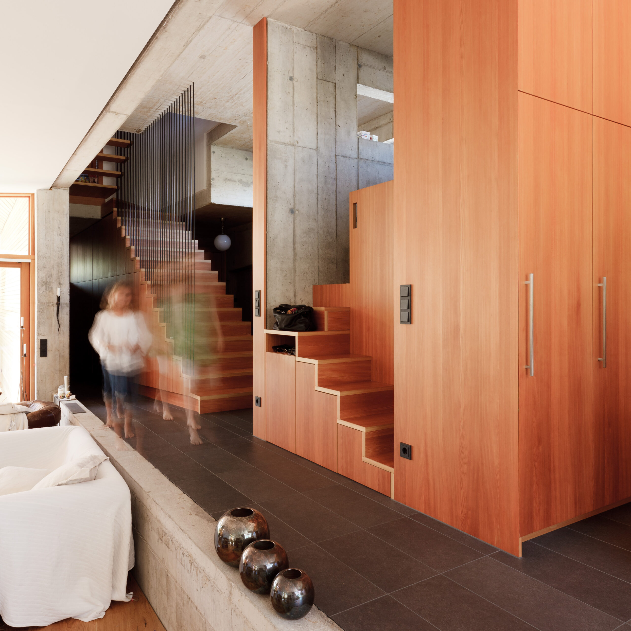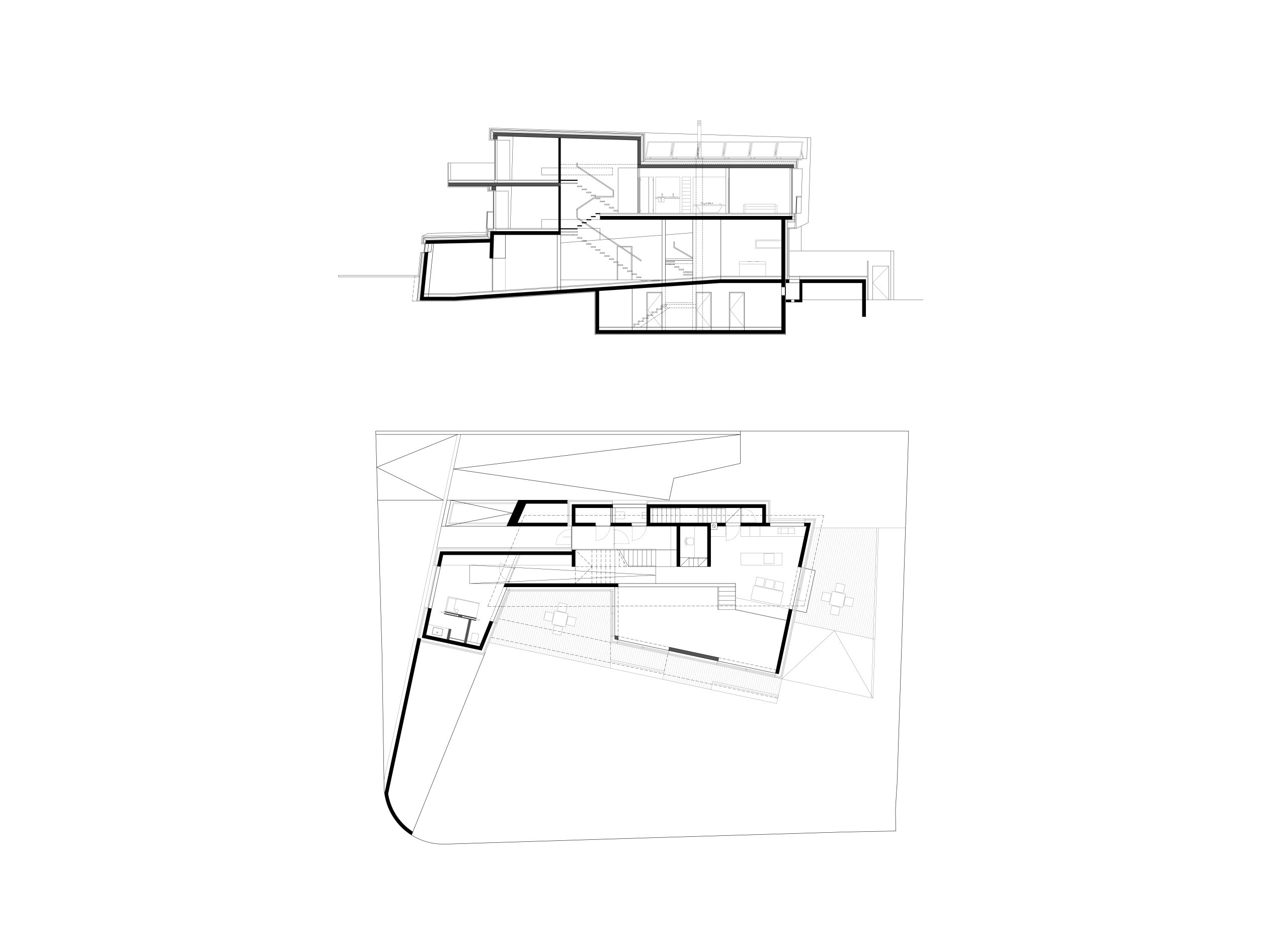 Das Gebäude positioniert sich selbstbewusst entlang der nördlichen Grundstücksgrenze und respektiert zugleich die städtebauliche Situation. Die Erschließung erfolgt von Westen, wodurch die südlich gelegene Gartenfläche weitgehend von Störungen freigehalten wird. Ausgehend von der vorhandenen Topografie entwickelt sich das Haus in unterschiedlichen Niveaus vom Garten aus nach oben.